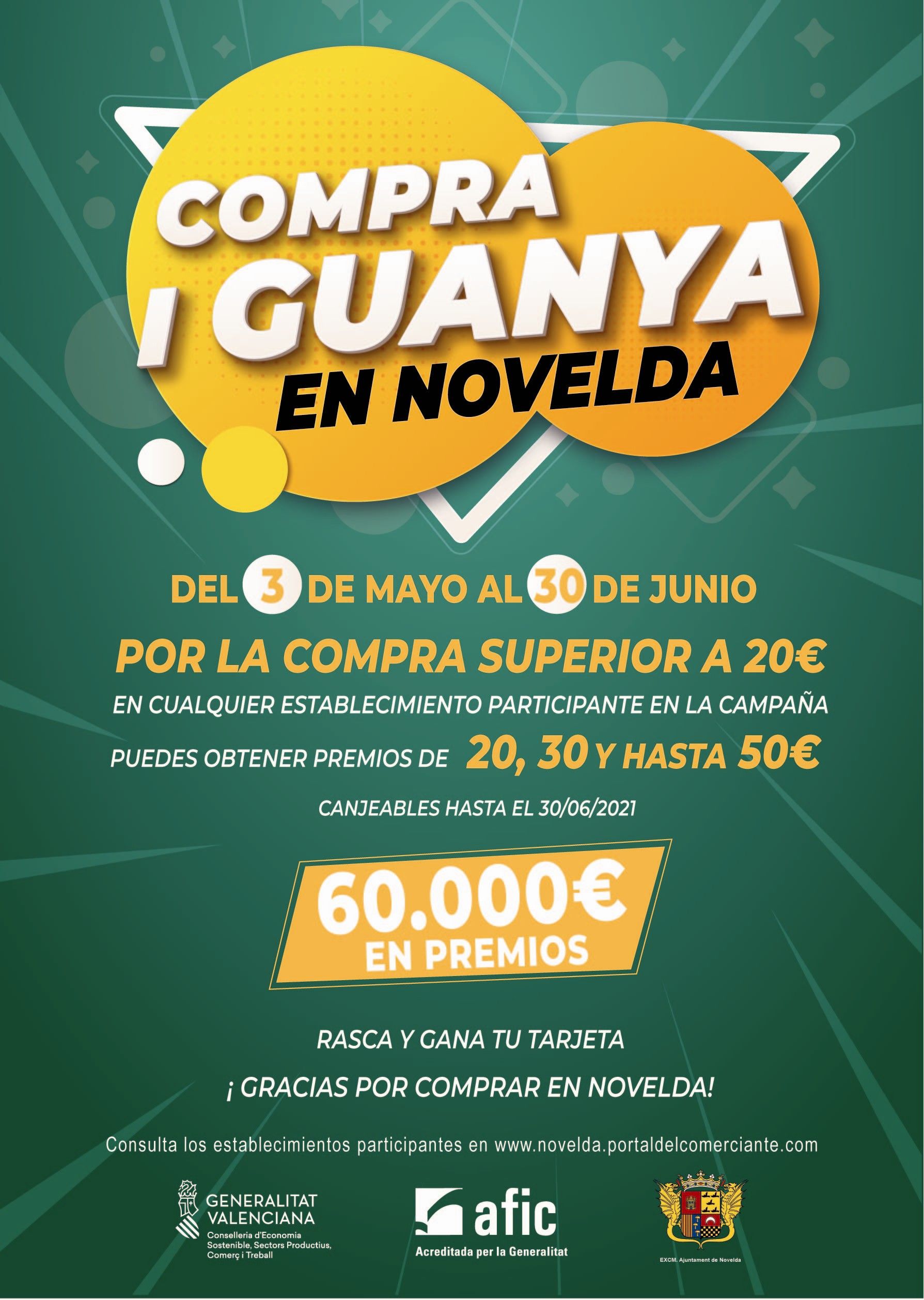 El Ayuntamiento de Novelda, a través de la concejalía de Comercio, Consumo y Mercado pone en marcha la segunda edición de la campaña Compra i Guanya, una iniciativa que inyectará 60.000 euros en los comercios locales a través de tarjetas con premios de 50, 30 o 20 euros que los clientes podrán canjear en compras o consumiciones en los establecimientos adheridos a la misma.