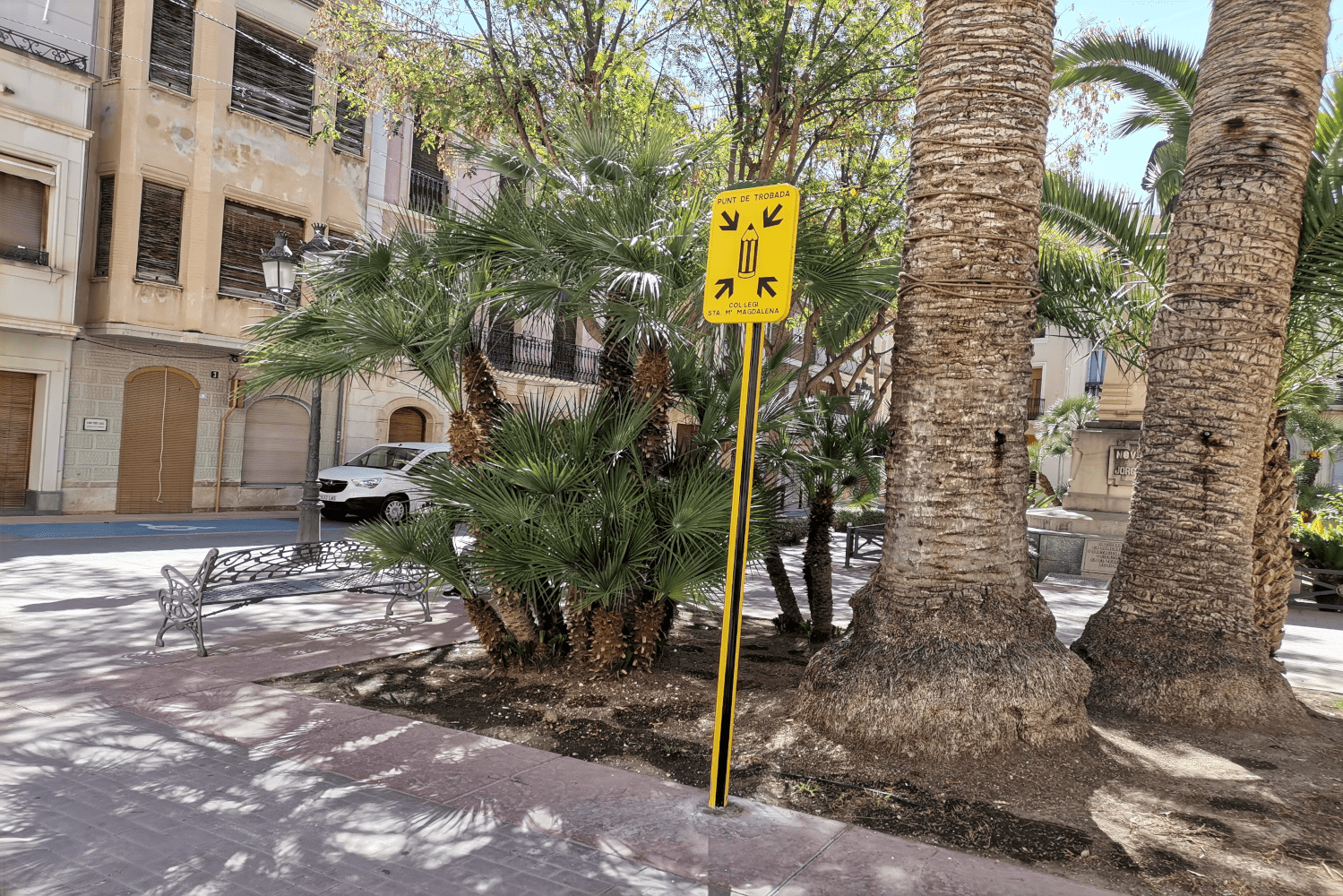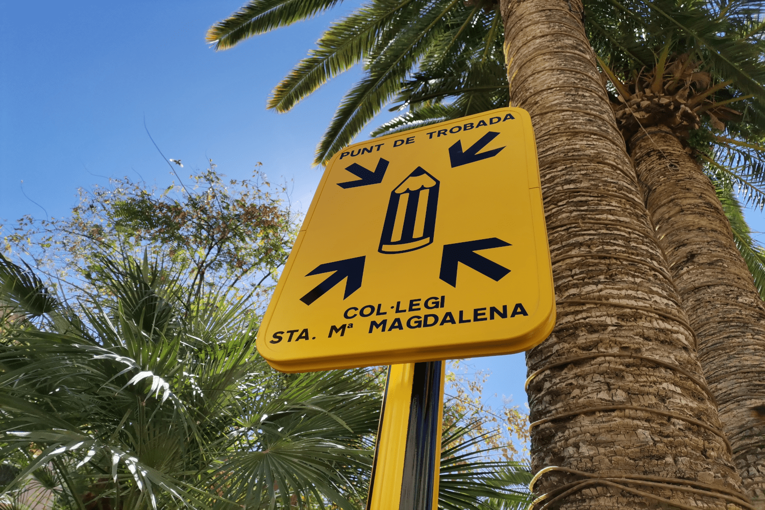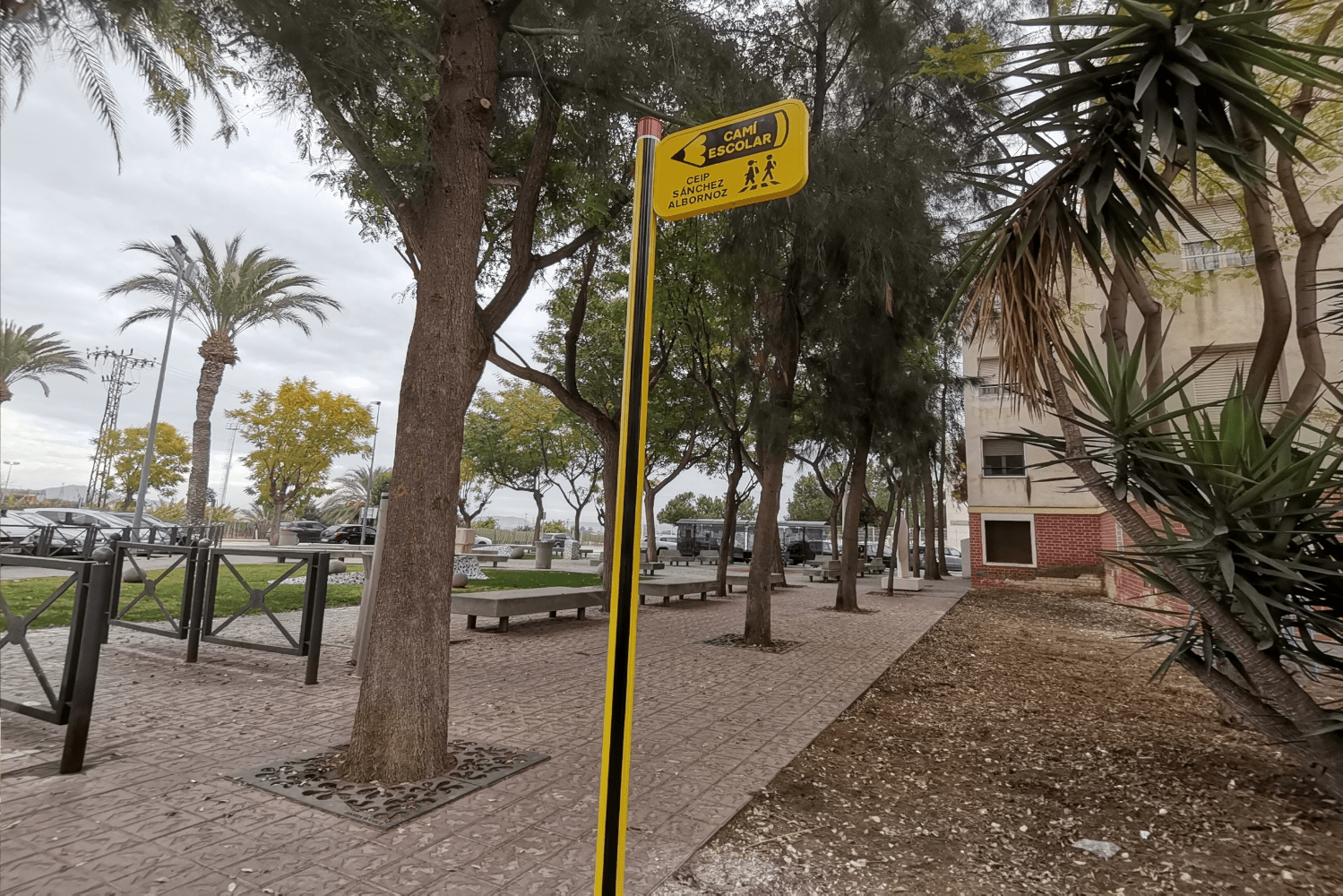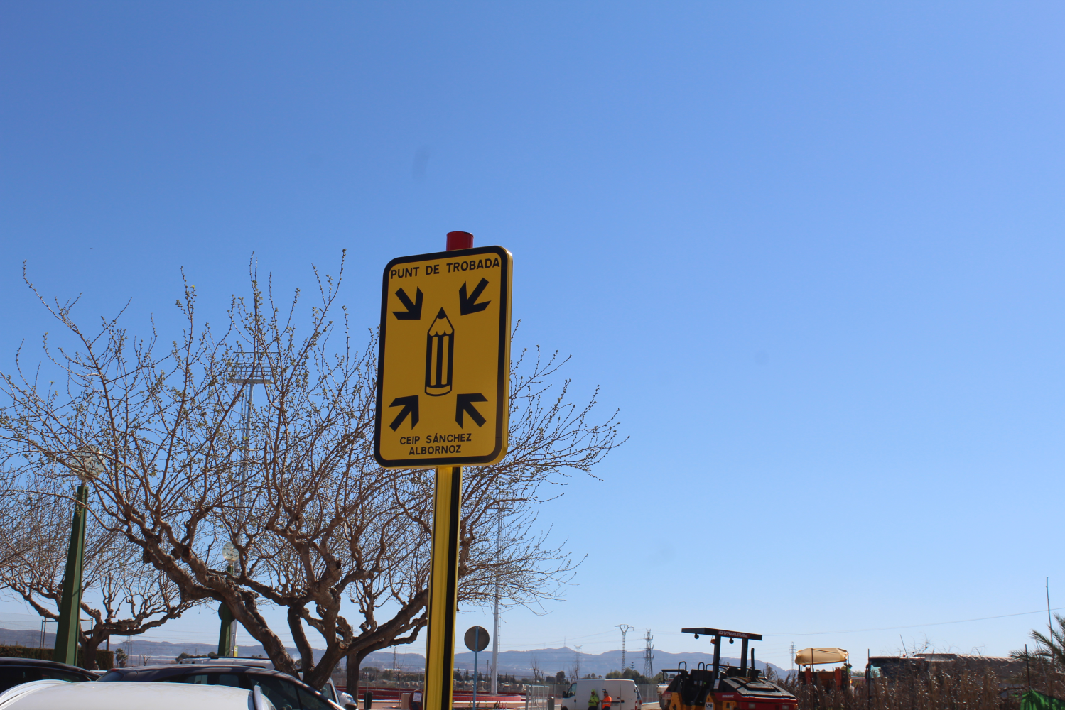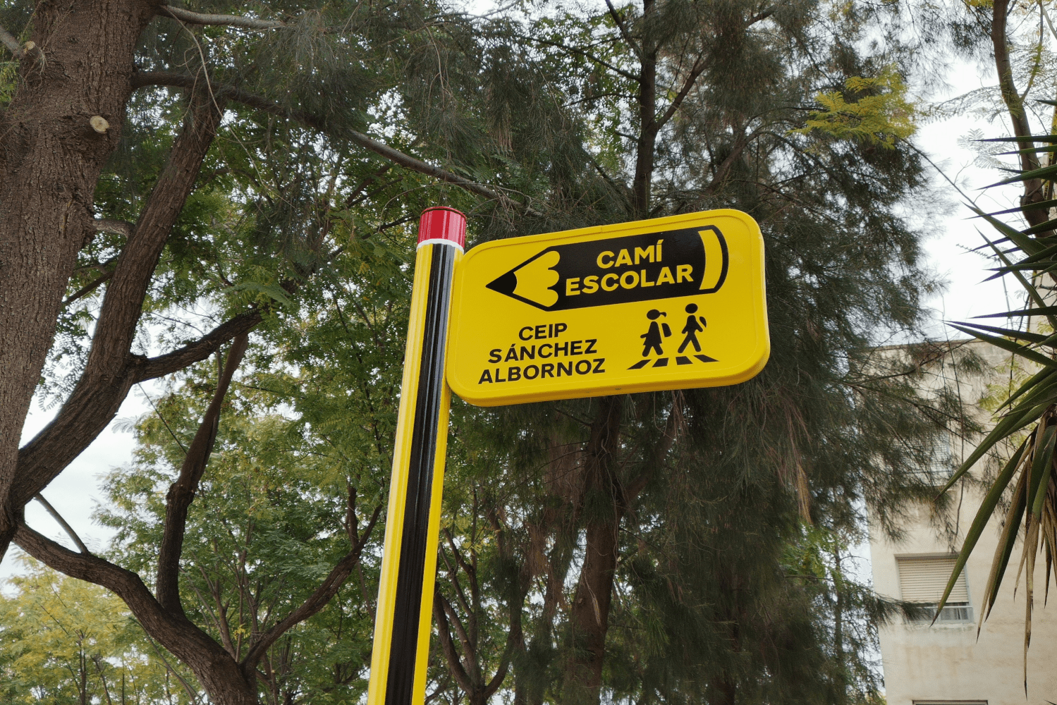 Una señalización vertical informativa, que indica el punto de encuentro e inicio del Camino Escolar Seguro, marcando dos posible rutas de itinerario desde el punto de encuentro a la entrada del centro docente, conforma la indicación en la vía urbana del camino escolar seguro, un proyecto pensado para facilitar la movilidad infantil, que persigue la sostenibilidad y promueve la autonomía de los escolares.
