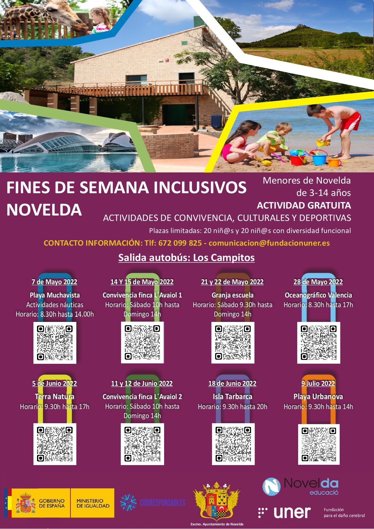 Las actividades de la iniciativa Fines de Semana Inclusivos, financiadas a través de una subvención de la Conselleria de Igualdad y Políticas Inclusivas, se desarrollarán durante ocho fines de semana, entre el 7 de mayo y el 9 de julio, y en ellas podrán participar hasta 40 niños, de entre 3 y 14 años, tanto neurotípicos y como con diversidad funcional, que podrán disfrutar de actividades náuticas, jornadas de convivencia o visitas a Granja Escuela, el Oceanogràfic de Valencia, Terra Natura o la Isla de Tabarca.