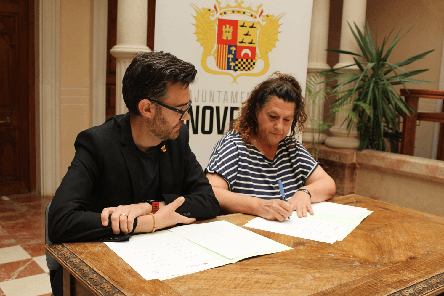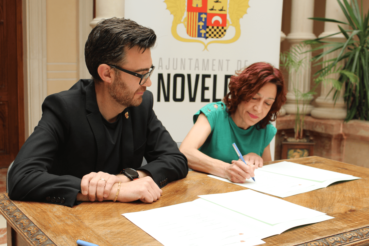 El alcalde de Novelda, Fran Martínez, y los presidentes y presidentas de las asociaciones de padres y madres de alumnos de los colegios Jorge Juan, Padre Dehon, San José de Cluny, Santa María Magdalena, Gómez Navarro, Alfonso X el Sabio, Jesús Navarro, Oratorio Festivo y Sánchez Albornoz y los IES Vinalopó y La Mola han firmado este convenio que, con un importe de 35.367€, se reparte de manera proporcional al número de alumnos participantes de cada uno de ellos y a las actividades realizadas, con importes que oscilan entre 12.027€ y los 1.247€.