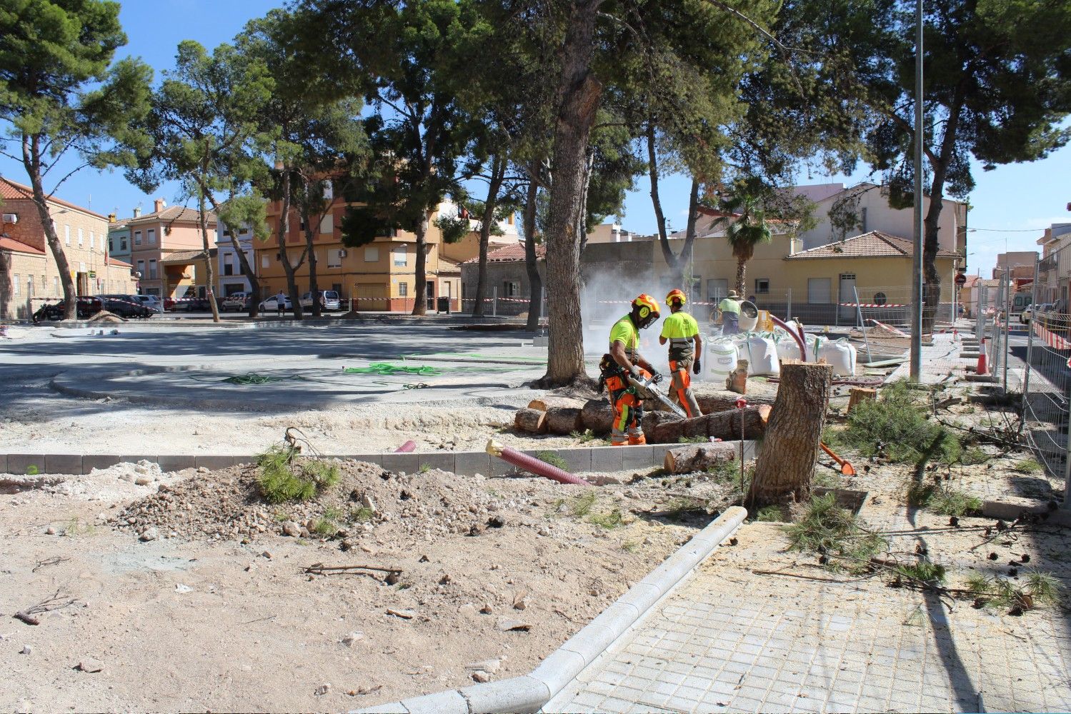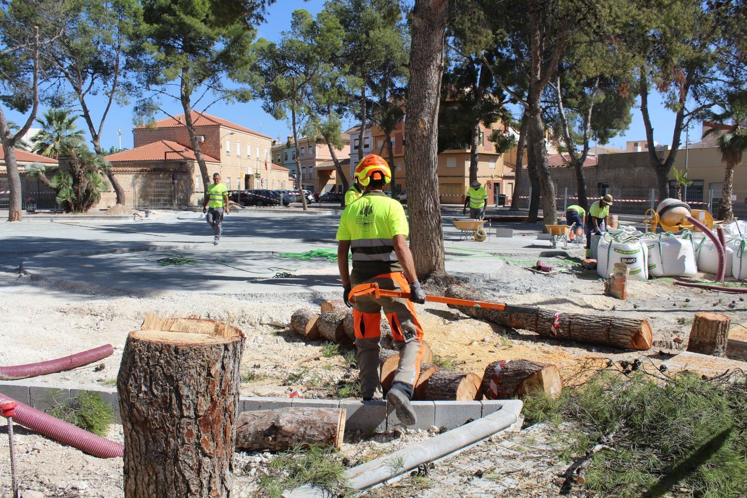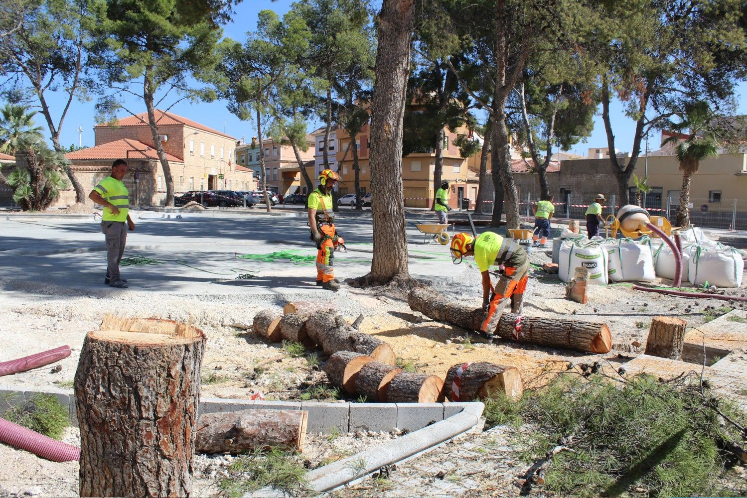 El Ayuntamiento de Novelda ha iniciado los trabajos de tala de siete de los pinos carrascos de la plaza de San Lázaro, una tarea recomendada por informe técnico externo solicitado a una empresa especializada en el marco del proyecto de remodelación del parque.