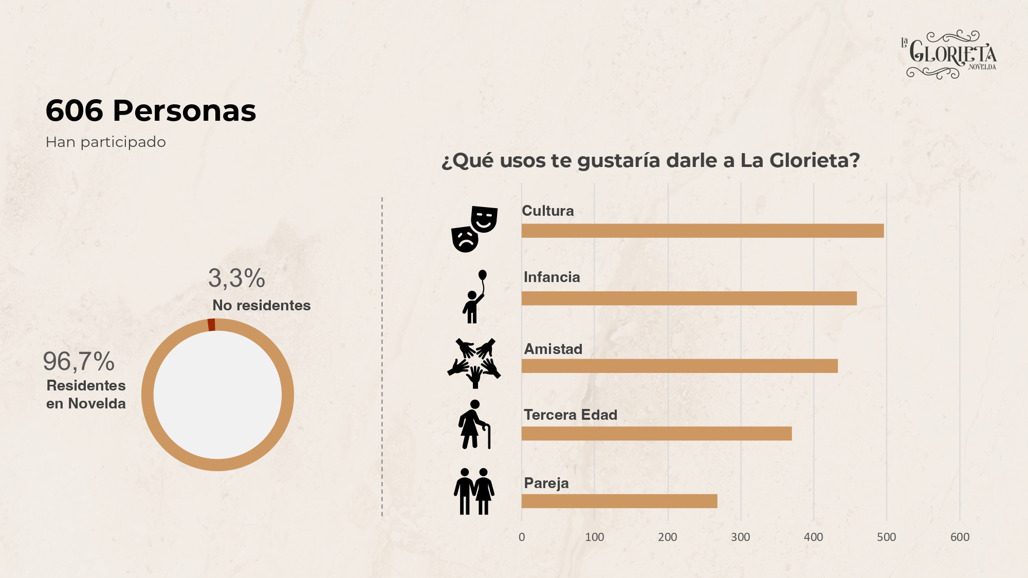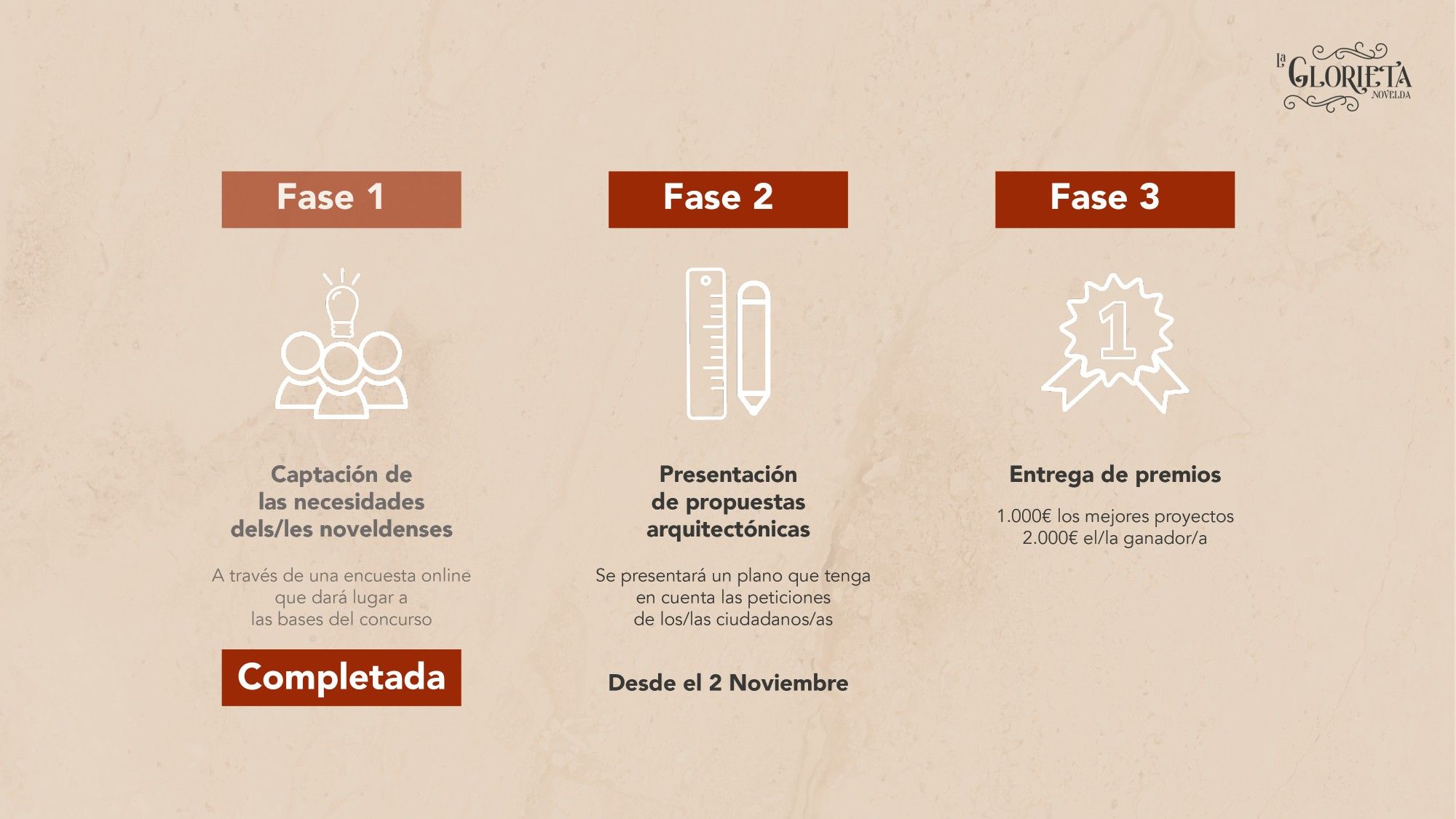 Una vez extraídas las conclusiones de la primera fase del proceso participativo se inicia una nueva etapa en la que los profesionales habilitados (arquitectos, ingenieros, etc) podrán presentar hasta el 12 diciembre, a través del correo electrónico laglorieta@novelda.es, un boceto de diseño, atendiendo las demandas ciudadanas y cuyas bases se pueden consultar en la página web novelda.es/la-glorieta.