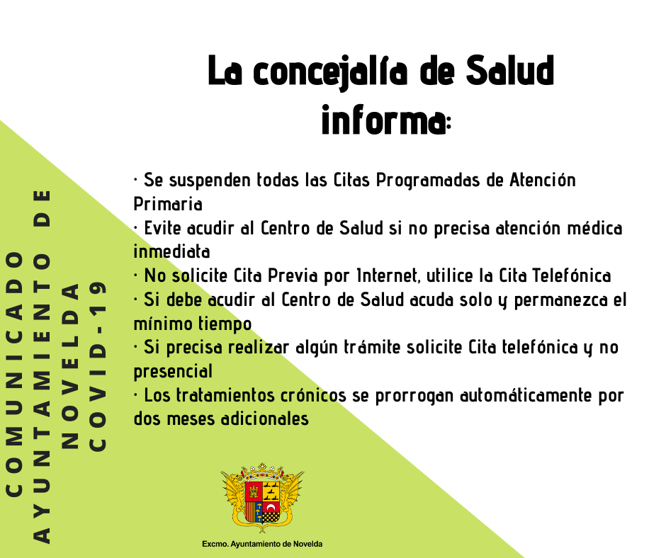 La concejalía de Salud hace un llamamiento a la responsabilidad social y pide a la ciudadanía que siga las recomendaciones realizadas desde el Centro de Salud de Novelda, el Departamento de Salud Pública de Elda y la Conselleria de Sanidad Universal y Salud Pública con el objetivo de minimizar riesgos y posible exposición al virus.