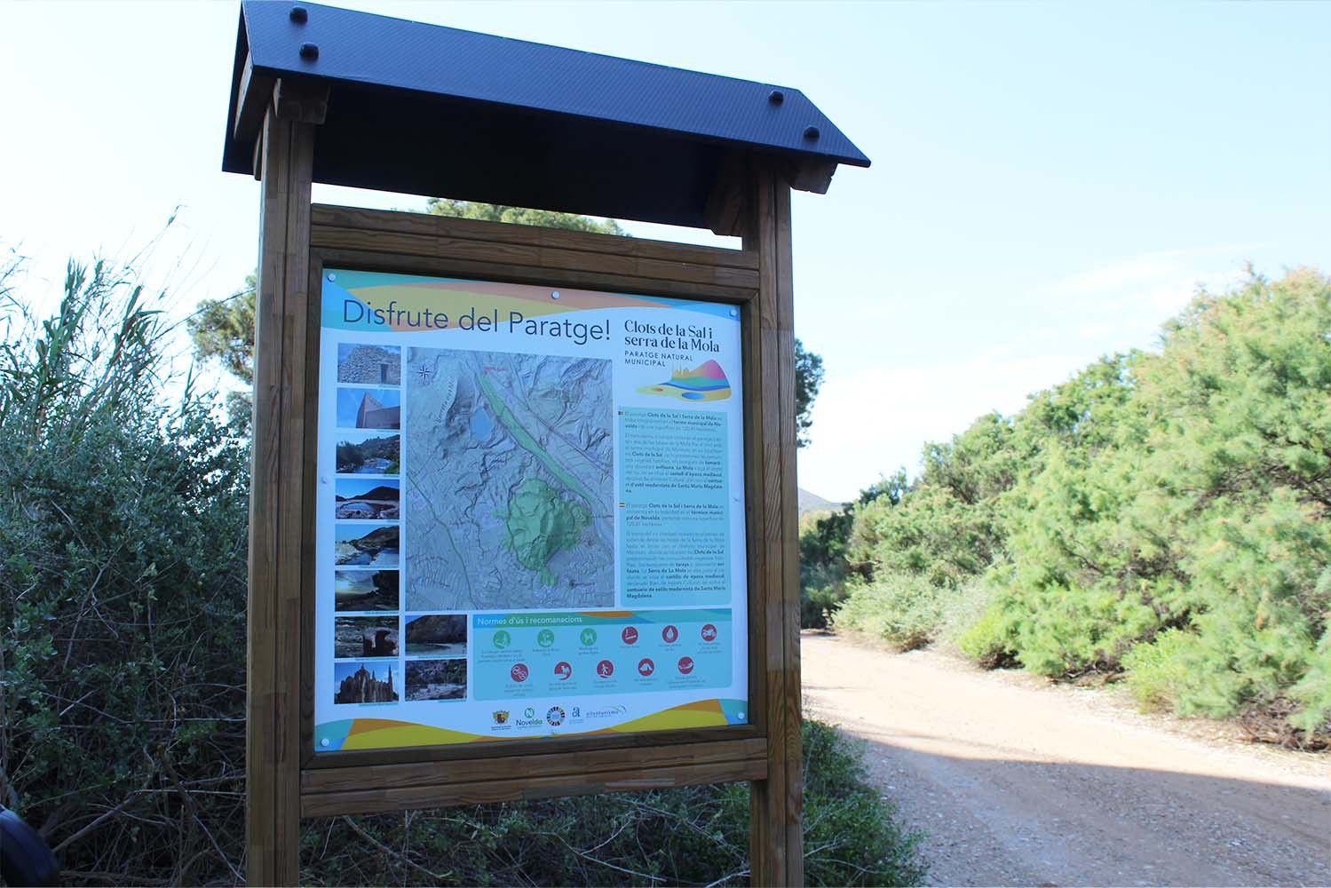 Los trabajos, que incluyen la colocación de dos paneles de presentación del paraje, en los accesos a través de Monóvar y La Mola, y dos paneles de interpretación ambiental, ubicados en el Clot Roig y el Clot Negre, en los que se dan a conocer las normas de comportamiento y el uso tradicional de los mismos, se completan con la instalación de un gran indicador de presentación del municipio y del propio paraje natural en el aparcamiento del Castillo de la Mola. Además este cartel estará acompañado por un panel que recogerá los senderos existentes en el municipio y toda la información técnica (PR-CV 311 Novelda-Castillo de la Mola, PR-CV 325 Novelda-Sierra del Cid, SL-CV 127 Ruta dels Clots de la Sal y SL-CV 174 Refugios Canteros).