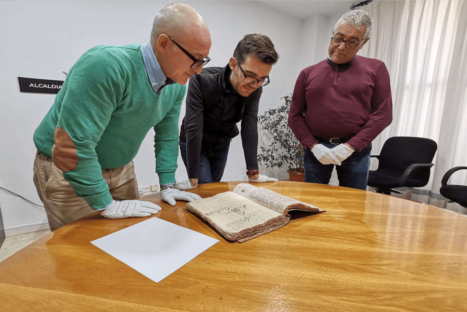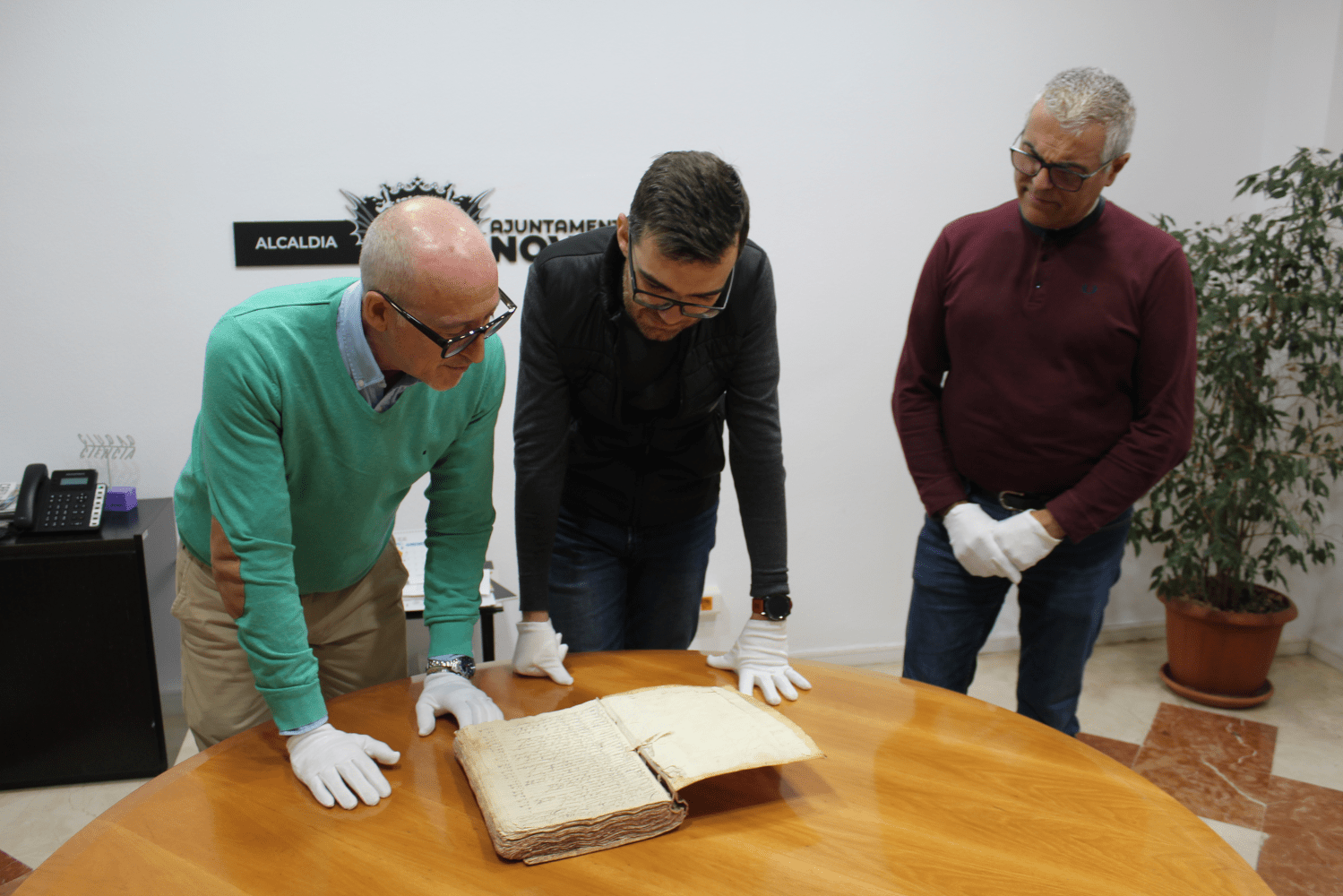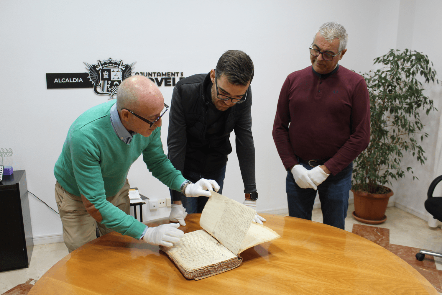 El alcalde de Novelda, Fran Martínez, junto al archivero municipal, José Luis Pellín, y al responsable de Archivo, Bibliotecas y Museo, Santi Sánchez, han presentado este libro de protocolo notarial que se ha adquirido, tras un largo proceso de investigación, a un coleccionista particular y que, en palabras del alcalde, “supone recuperar una pequeña parte de nuestro patrimonio histórico”.