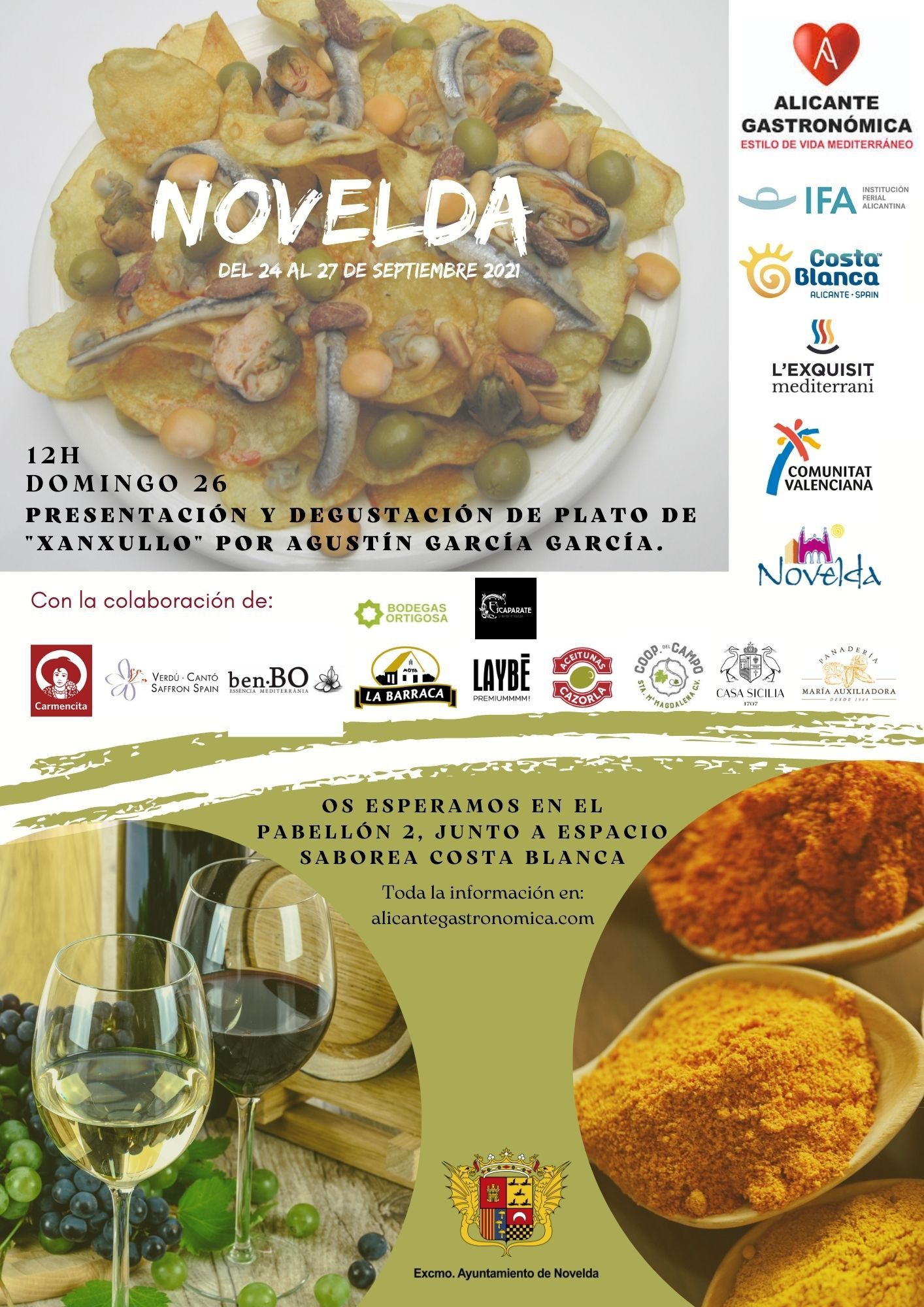 El Ayuntamiento de Novelda acude a esta tercera edición con un stand de 40m2 en el que participarán las empresas locales Horno M.ª Auxiliadora, Verdú Safrón, La Barraca, Cooperativa Santa María Magdalena, El Escaparate, Ben Bo, Laybe, Carmencita, Aceitunas Cazorla y Bodega Heretat de Cesilia. Además está previsto que el domingo, desde la 12:00h, Agustín García ofrezca una sesión de elaboración y degustación de xanxullos, típico aperitivo noveldense que combina diferentes ingredientes procedentes, en su mayoría, de las conservas del mar sobre un lecho de patatas.