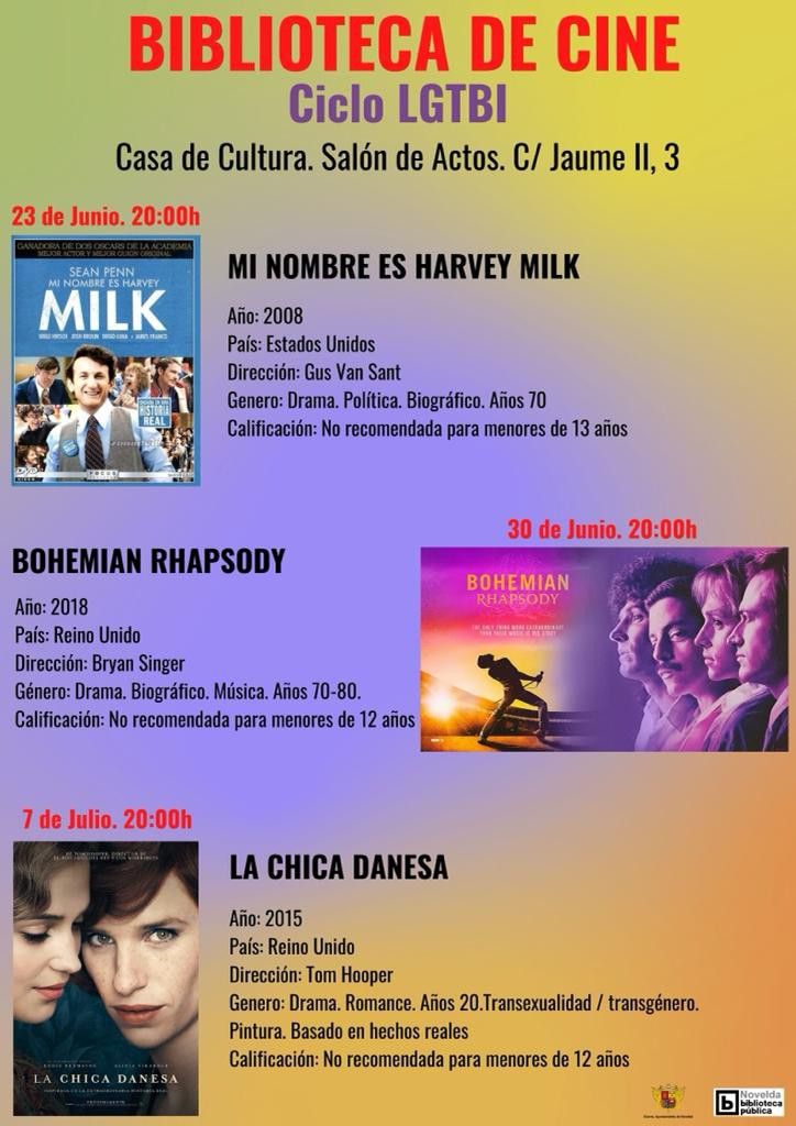 La Biblioteca Municipal también se suma a la conmemoración con un ciclo de Cine con temática LGTBIQ+ que se desarrollará en el Salón de Actos de la Casa de Cultura, los días 23 y 30 de junio y 7 de julio, con la proyección de las películas “Mi nombre es Harvey Milk”, “Bohemian Rhapsody” y “La Chica Danesa”, y la promoción de su sección de temática LGTBIQ+, a la que se sigue dotando periódicamente de material tanto escrito como audiovisual, y la selección de títulos que ha realizado en la plataforma ebiblio digital de la Generalitat.