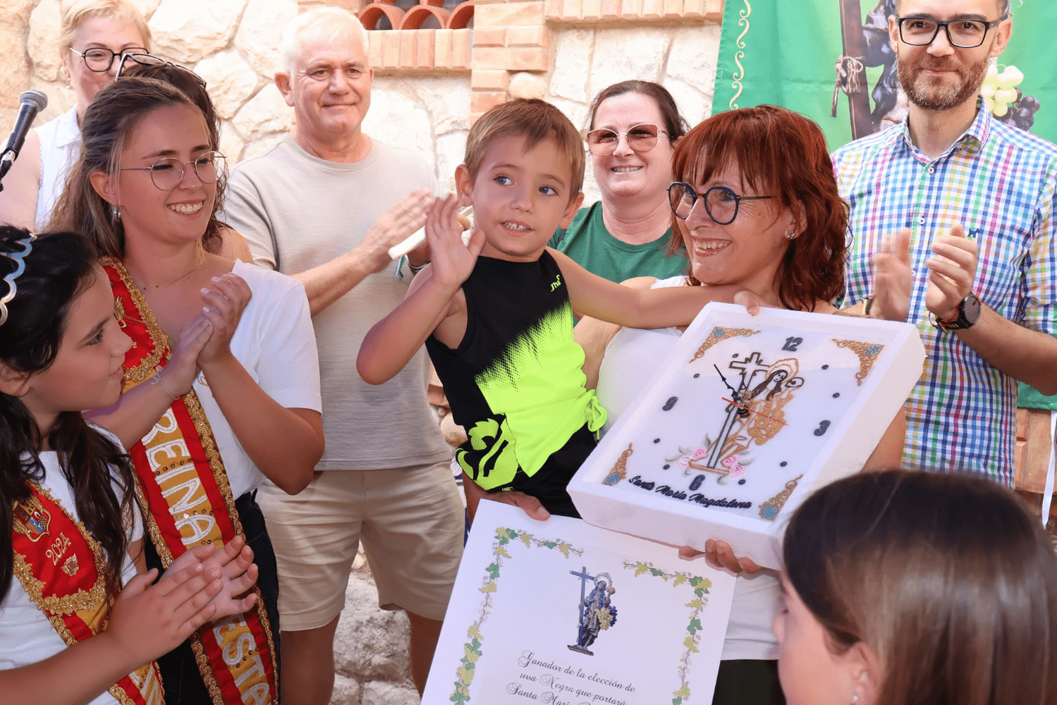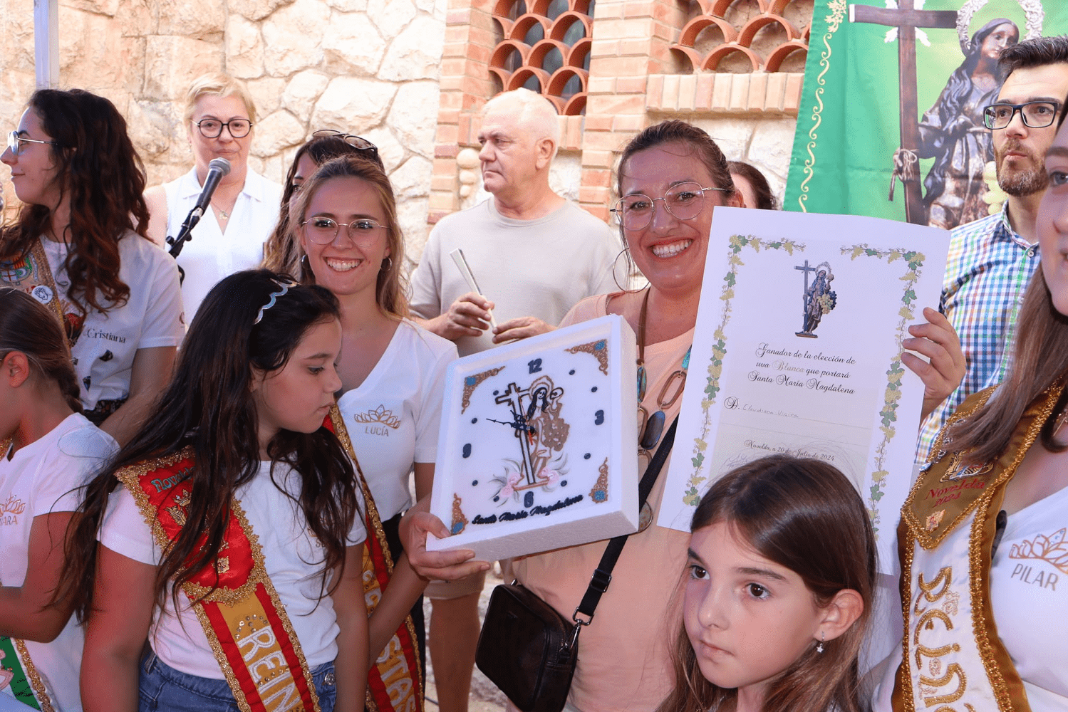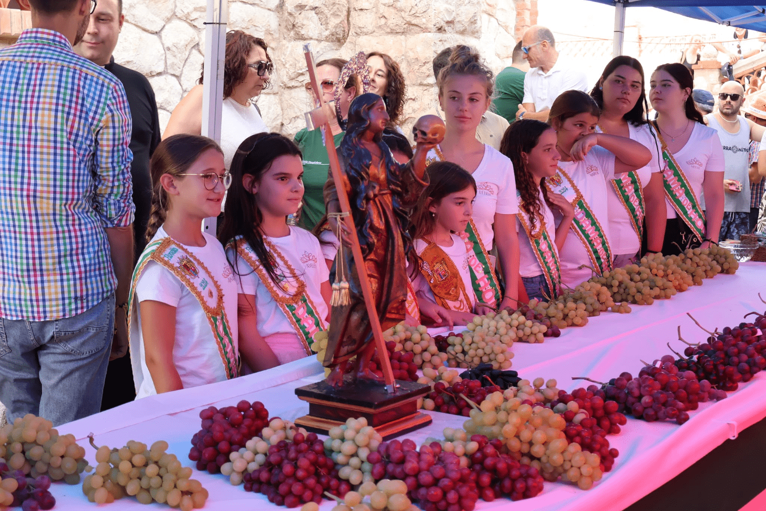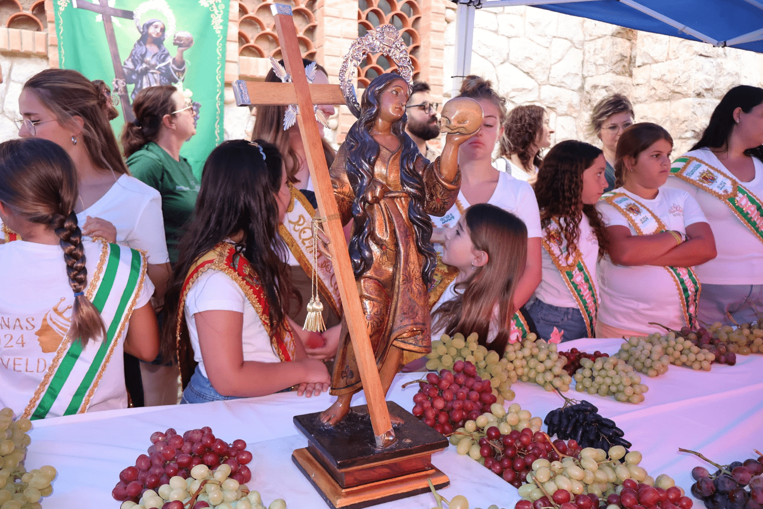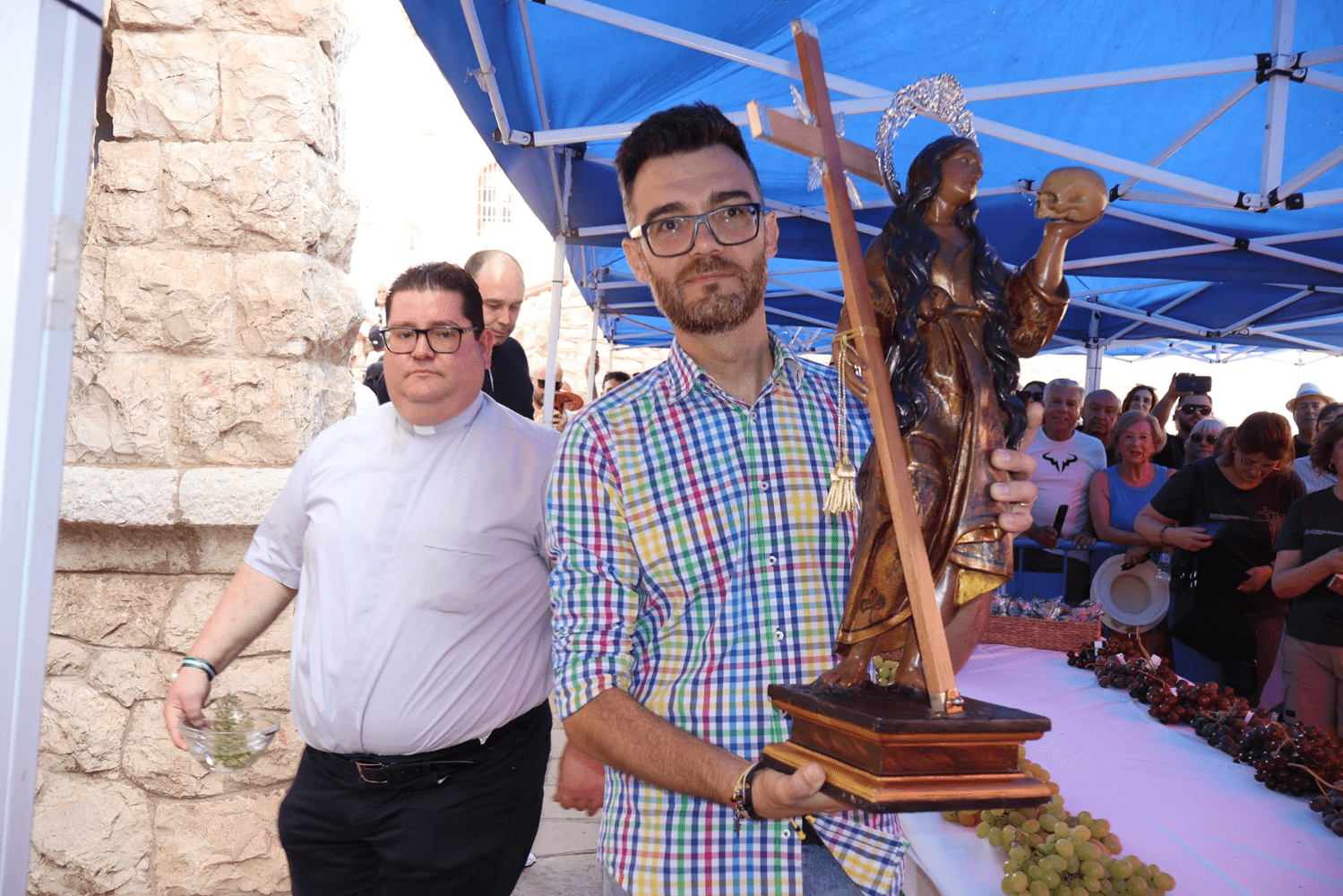 Las uvas blancas de Claudiana Vieira y las uvas negras de Ernesto Abad Jiménez engalanan ya a nuestra patrona, Santa María Magdalena, tras el tradicional acto de elección de las uvas que se ha celebrado esta mañana a los pies del Santuario.