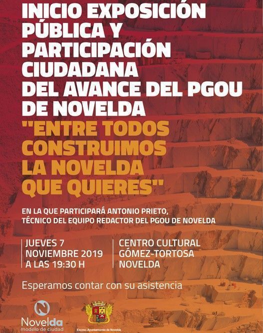 El avance del Plan General de Ordenación Urbana (PGOU) de Novelda continúa su periodo de exposición y participación pública con un acto abierto a la ciudadanía el jueves, 7 de noviembre, a las 19:30 horas en el Centro Cultural Gómez-Tortosa.