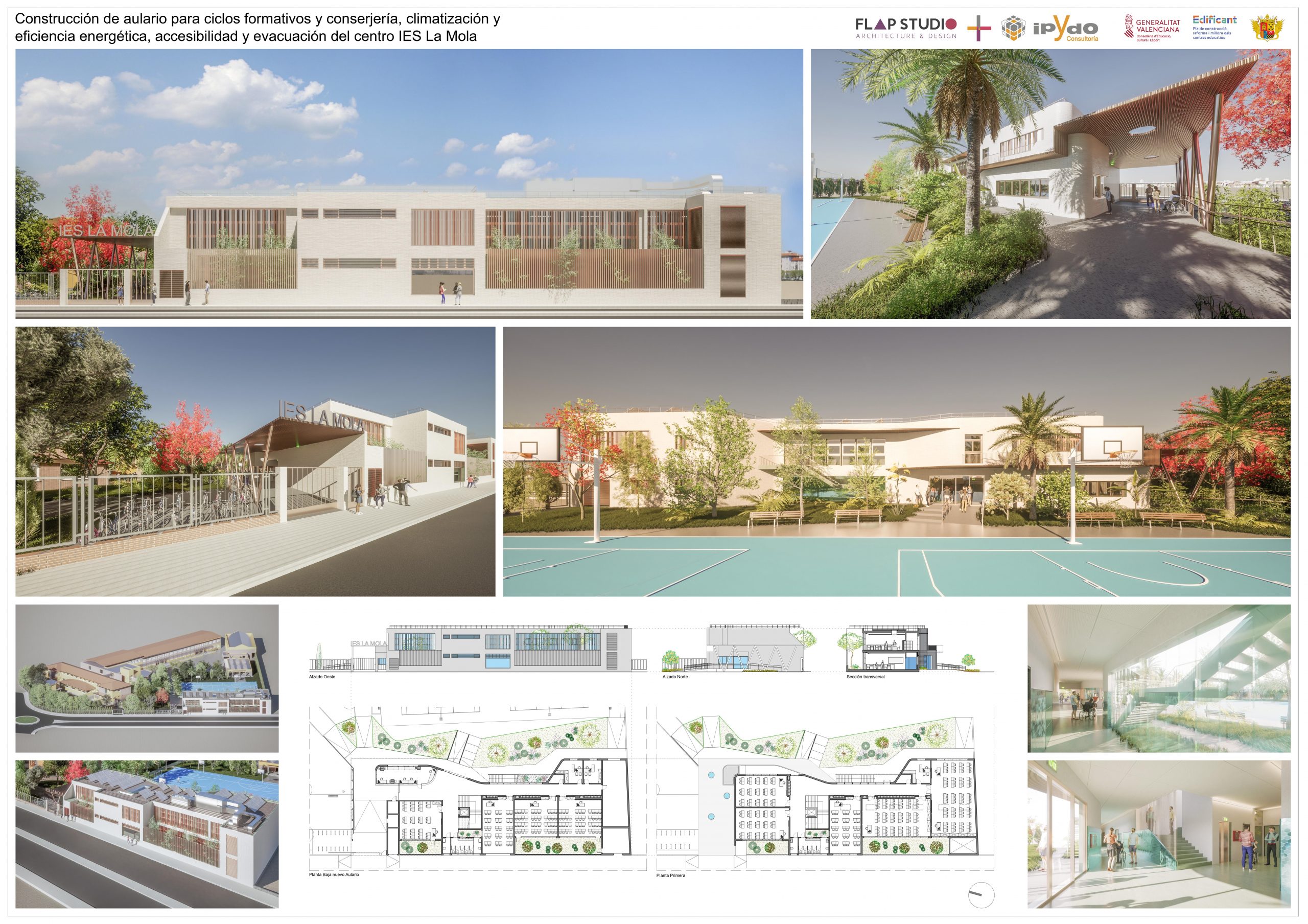 La propuesta para el IES La Mola, redactada por Flap Studio, contempla la construcción de un nuevo edificio que albergará, en su plata baja, la conserjería del centro, zona de almacenaje y cuatro aulas destinadas a los ciclos formativos dedicados a informática y agrojardinería, mientras que las aulas de la primera plata se centrarán en las áreas de marketing y comercio.