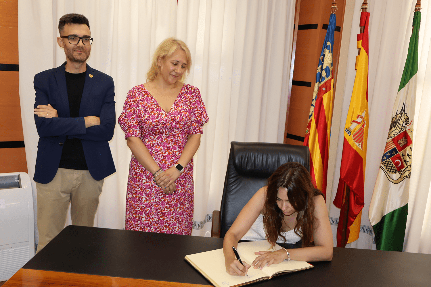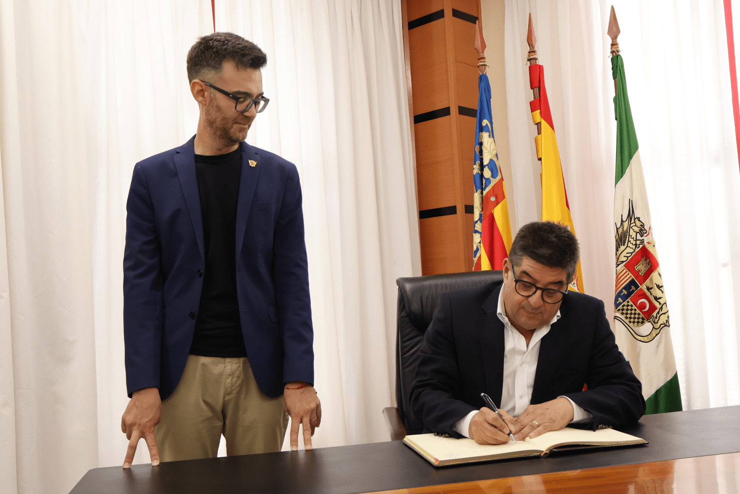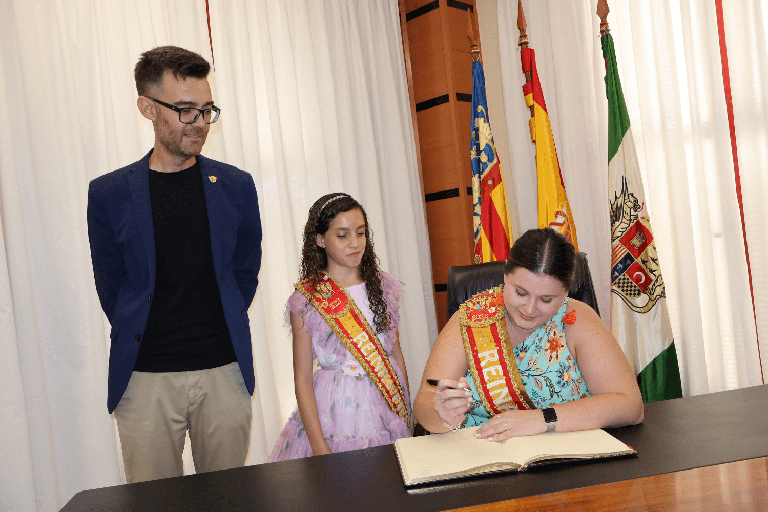 El despacho de Alcaldía ha acogido hoy el inicio de una nueva tradición: la firma en el Libro de Oro de la ciudad de los máximos representantes de las fiestas patronales y de moros y cristianos en honor a Santa María Magdalena, una iniciativa que se ha arrancado con los cargos de 2023, que mañana se despiden, y que continuará en unos días cuando sean los de 2024 los que dejen plasmado para la posteridad su sentimiento en el Libro de Oro de la ciudad.