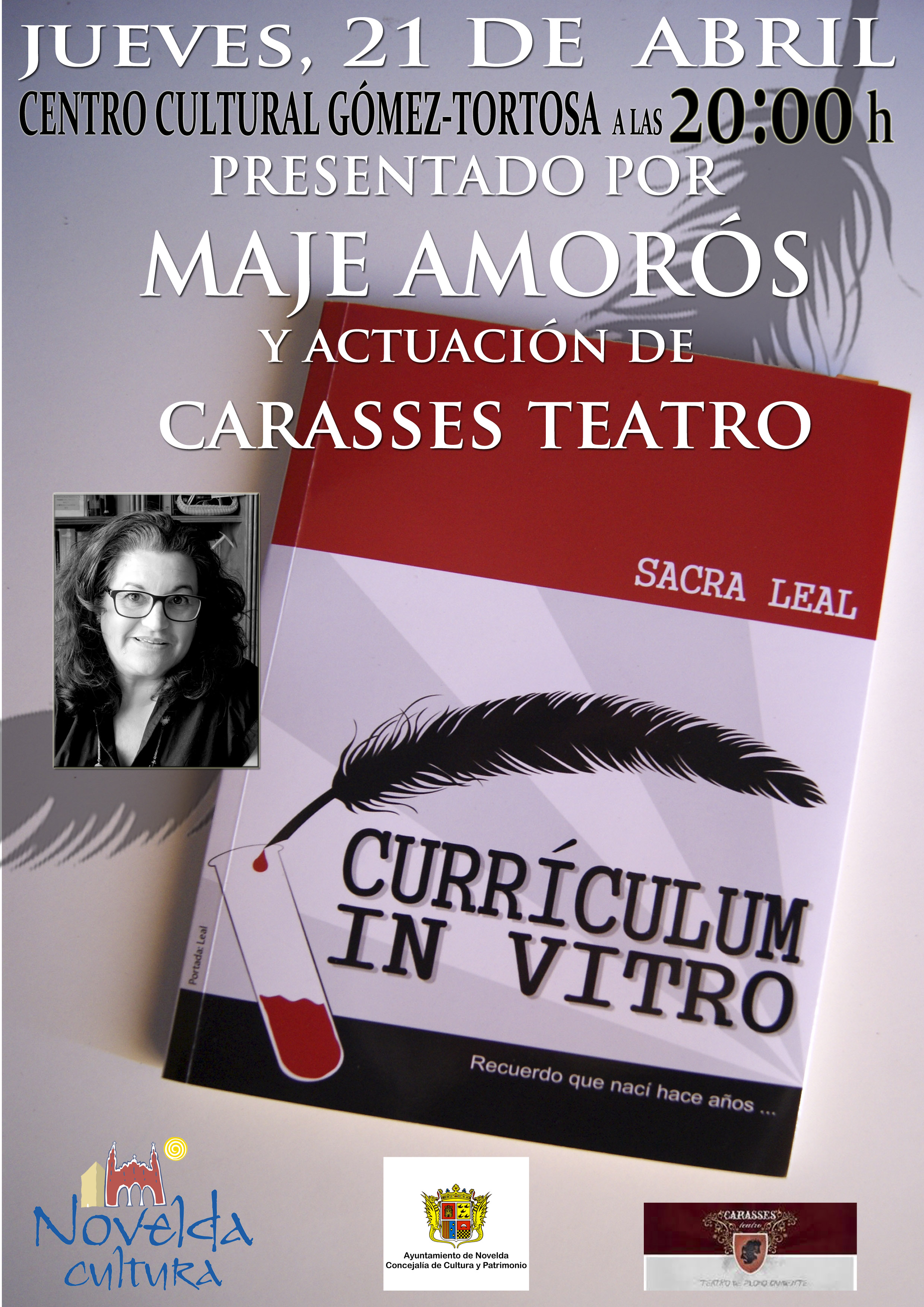 Jueves día 21, a las 20:00 h. Centro Cultural Gómez-Tortosa. Semana del libro. Presentación de «Currículum in vitro», poemario de Sacra Leal y lectura de poemas por miembros del grupo Carasses, de Petrer. Organiza: Concejalía de Cultura y Patrimonio.