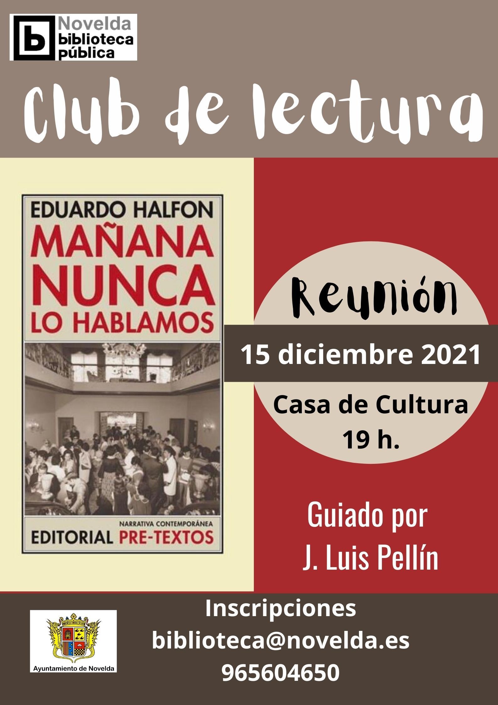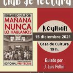 El club de lectura de adultos, dirigido por José Luis Pellín, se reunirá el próximo miércoles, 15 de diciembre, a las 19:00h, con el inicio de la lectura del libro de Eduardo Halfon, “Mañana nunca lo hablamos”.