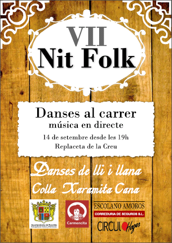 Sábado día 14, de 19 a 1 h., en la Replaceta de la Creu. 7ª edición de la Nit Folk (Taller de danses populars – para iniciar al público en el baile -, danses y sopar de cabasset).