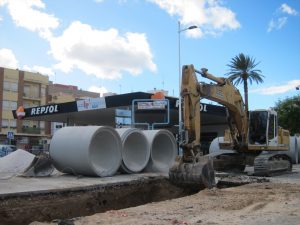 La obra, con un presupuesto de más de 1,5 millones de euros, sustituirá las conducciones unitarias actuales que datan de 1960 y permitirá la separación en la recogida de las aguas pluviales y fecales. Para ello contemplaba la construcción de dos colectores, uno, ya finalizado, que discurre por las calles Cura González y Luis Pérez Beltrá hasta el río Vinalopó , recogiendo, en sus 1.237 metros lineales de tuberías, el agua de lluvia de cuatro cuencas rurales que ocupan una superficie de casi 700.000 metros cuadrados y que, según el estudio hidrológico, pueden recoger un total de 1,384 metros cúbicos por segundo, y una segunda conducción, recién iniciada, que sigue la línea marcada por las calles Emilio Castelar, Travessia, Sargento Navarro y Médico Sala hasta el río. En este caso la conducción, que estará integrada en la red de alcantarillado, tendrá más de mil metros lineales, recogerá el agua de diez cuencas urbanas, con un área total de 662.016 metros cuadrados y una posible captación de agua de 12,797 m3/s.