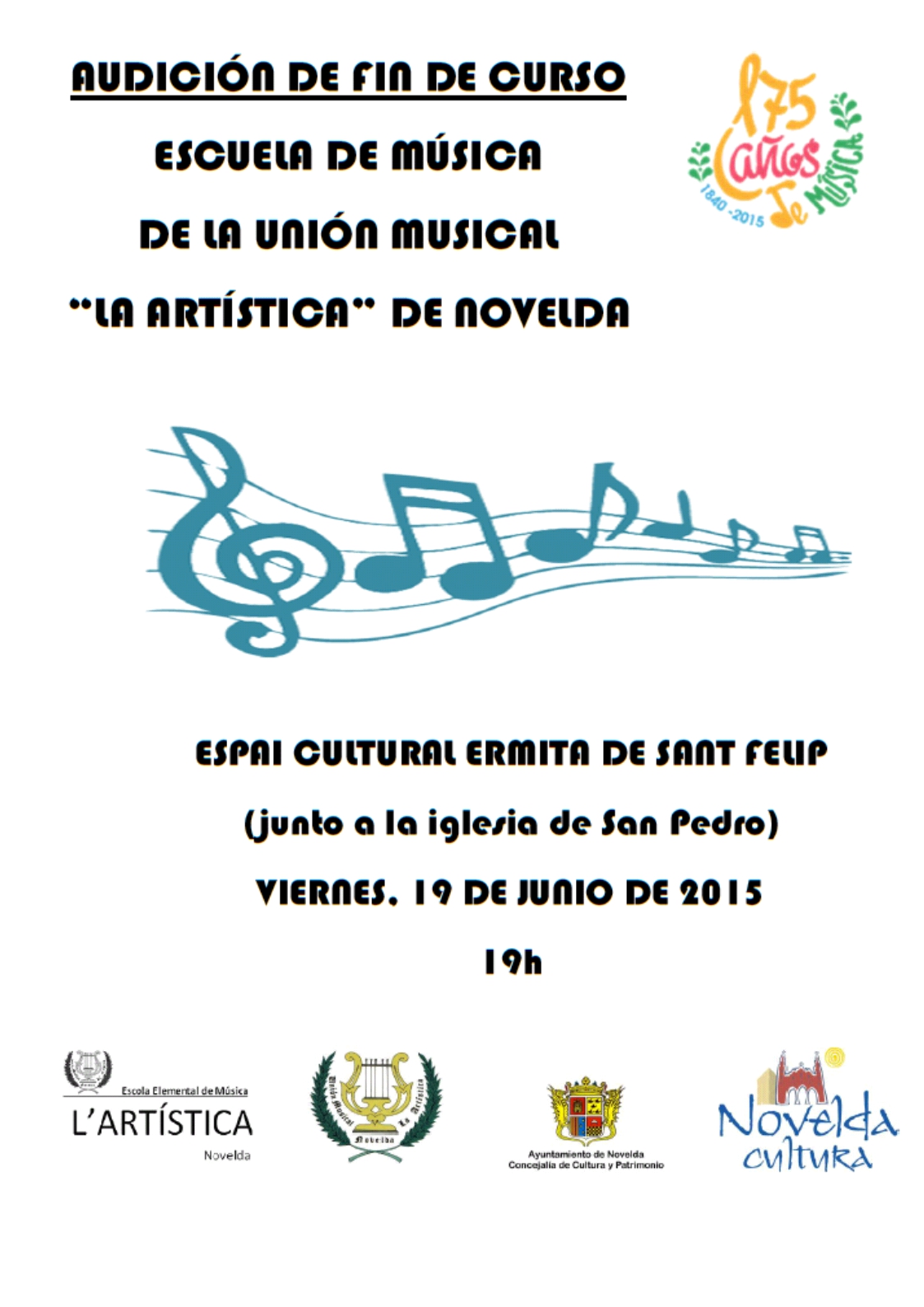 2015-06-19 CONCIERTO LA ARTISTICAViernes día 19, a las 19’00 h. en el Espai Cultural Ermita de Sant Felip. Audición de fin de curso de la escuela Unión Musical “la Artística”.