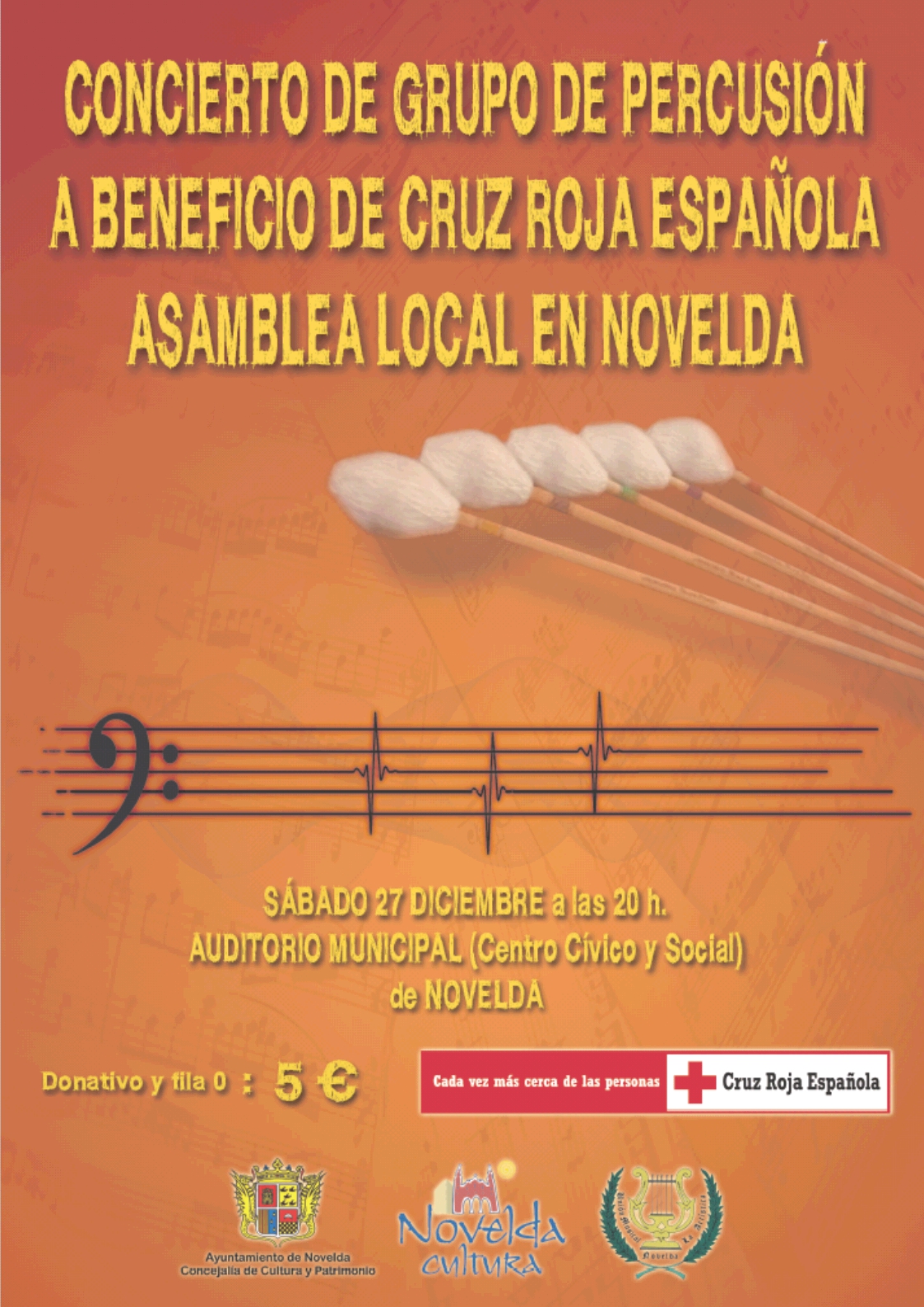 2014-12-27 CONCIERTO DE PERCUSIONSábado día 27, a las 20’00 h., en el Auditorio Municipal. Concierto de grupo de percusión, a beneficio de Cruz Roja Española Asamblea de Novelda.