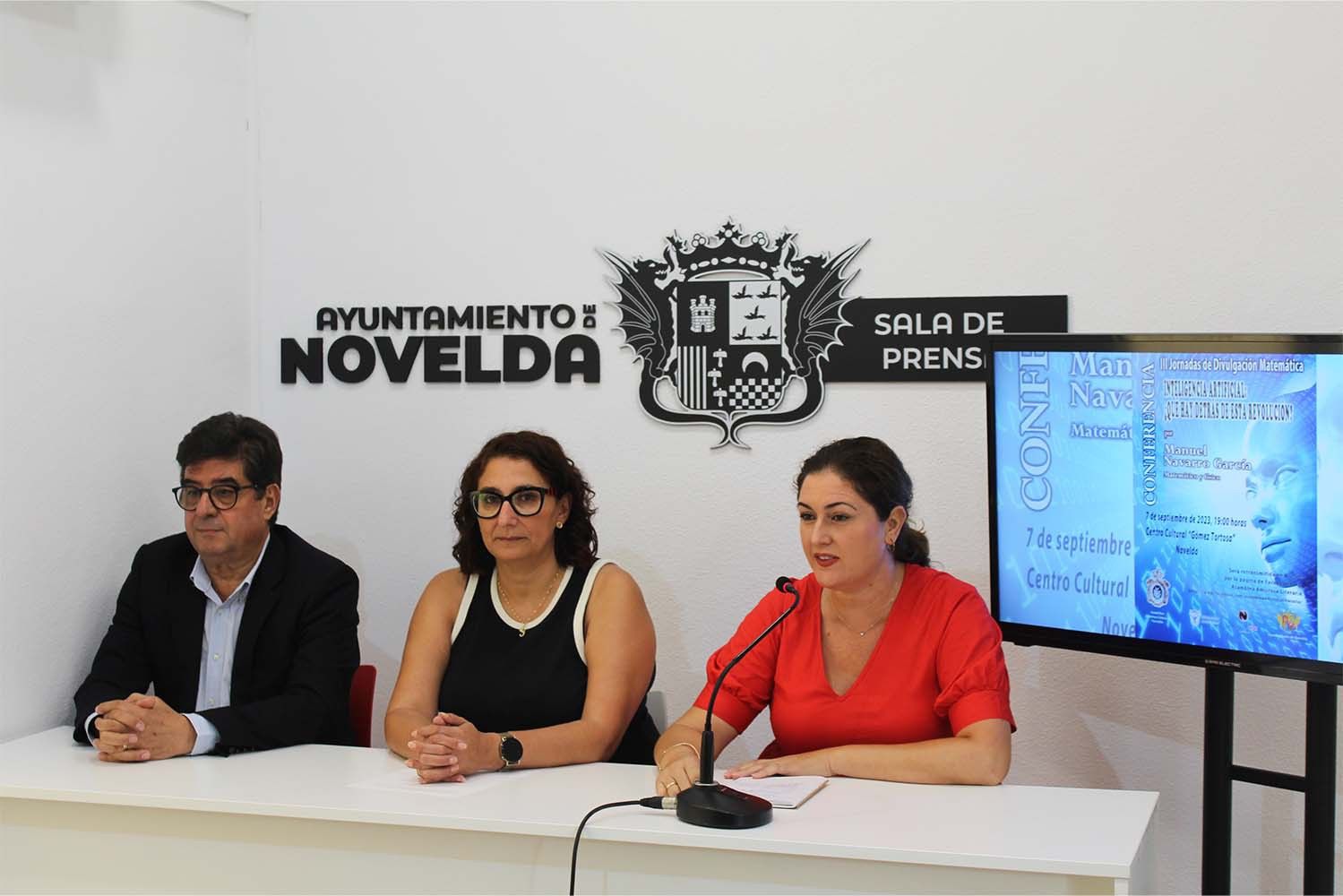Lorena Segura, coordinadora de las Jornadas de Divulgación Matemática, acompañada por la concejala de Cultura, Geno Navarro, y Vicente Baus, presidente de la Asamblea Amistosa Literaria de Novelda, ha señalado que el principal objetivo de la iniciativa es “acercar a la sociedad, con un lenguaje accesible, sencillo y ameno, la intervención de las matemáticas en aplicaciones de nuestra vida diaria y potenciar, reconocer y poner en valor el talento matemático de nuestra localidad”.