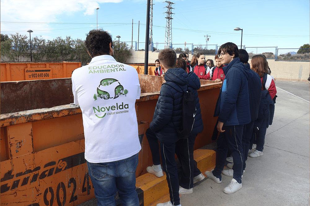 Durante la visita los alumnos de los centros educativos de Novelda están acompañados por un educador ambiental, guía que los orienta por las instalaciones para que, a través de explicaciones y juegos, conozcan el funcionamiento y el papel del Ecoparque Municipal como el servicio de gestión de residuos del municipio.