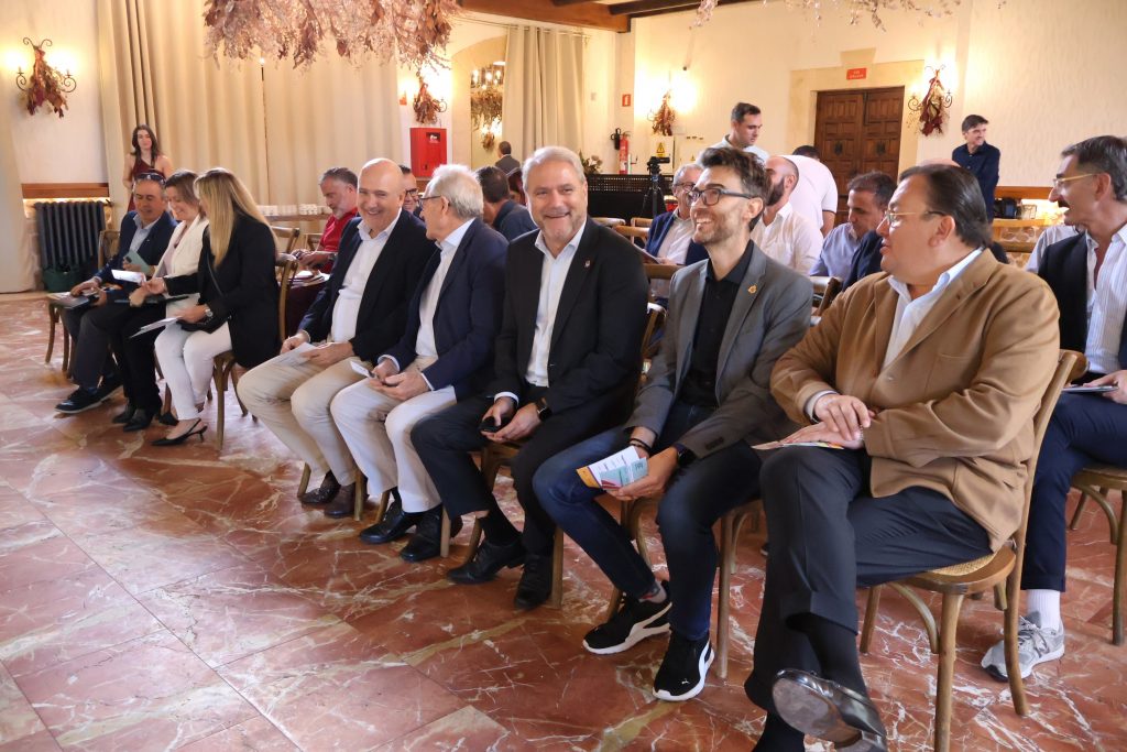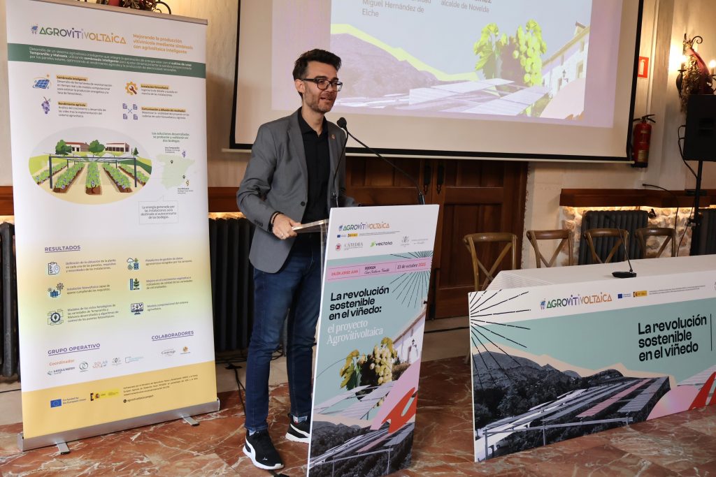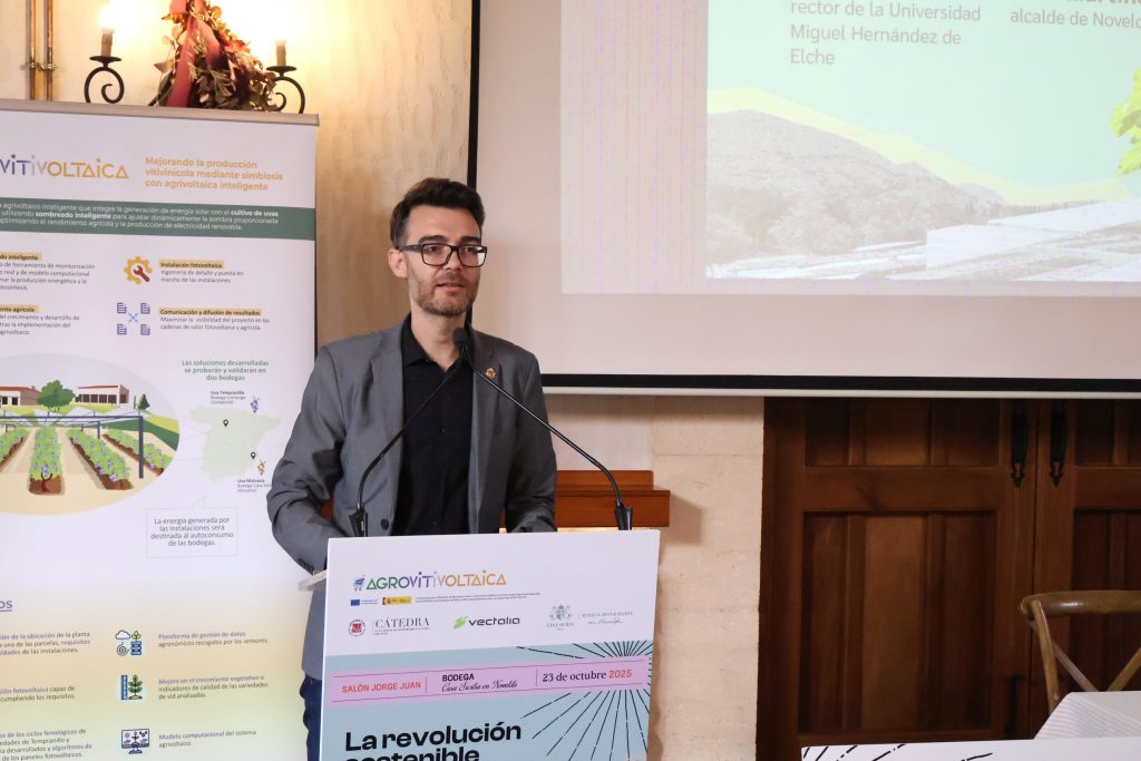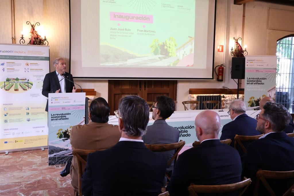 Fran Martínez, al costat del rector de la Universitat Miguel Hernández, Juan José Ruiz, ha obert este matí la jornada tècnica que, sota el títol La revolució sostenible en la vinya: el projecte Agrovitivoltaica, s’ha celebrat en les instal·lacions del celler Casa Sicília i en la qual experts i professors universitaris han analitzat una iniciativa pionera que busca la integració de l’energia fotovoltaica en el cultiu de la vinya, oferint solucions innovadores i més eficients, compatibles amb la sostenibilitat del sistema.