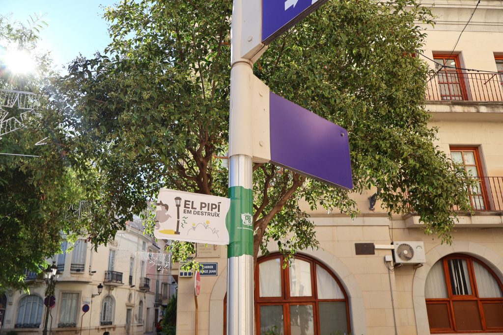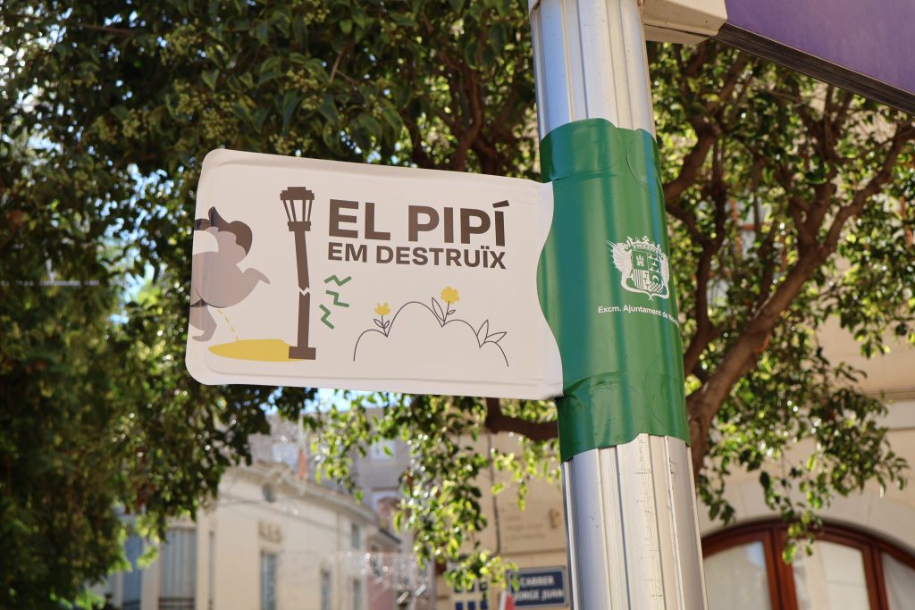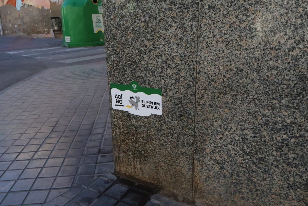 “No deixes el marró”, “Arreplega la caca”, “Neta el *pipí”, “Pensa en els altres” o “Arreplega i neta” són els missatges que llança esta campanya que es desplegarà, durant les pròximes setmanes, amb adhesius i banderoles en el mobiliari urbà. A més, façanes de diversos edificis lluïxen ja missatges com “Ací no, el pipí em destruïx”, recordant el mal que els orines provoquen en parets i mobiliari.