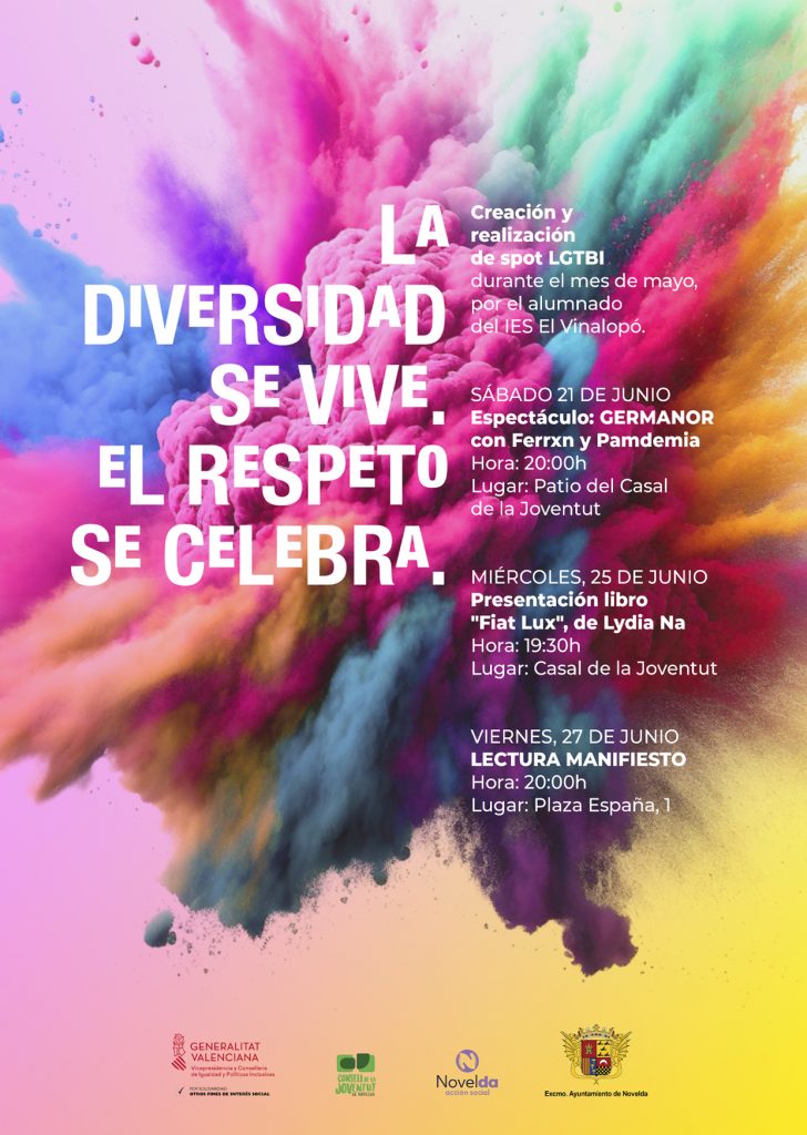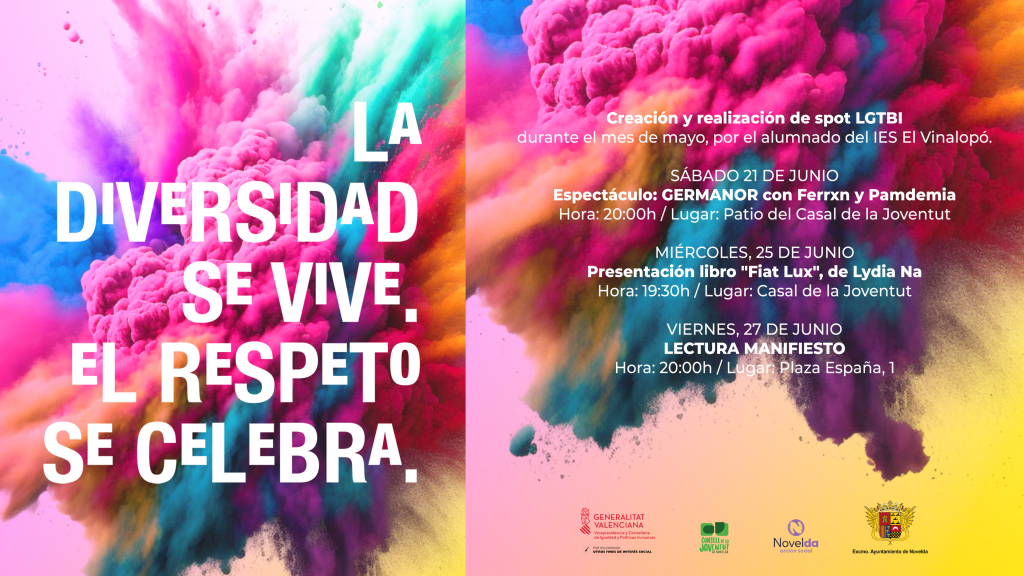 Sota el lema “La diversitat es viu, el respecte se celebra” l’Ajuntament de Novelda se suma, un any més, a la celebració, el pròxim 28 de juny, del Dia Internacional de l’Orgull LGTBIQ+ amb una programació d’activitats amb la qual es pretén donar visibilitat al col·lectiu i mostrar el compromís de la ciutat amb les valores democràtics d’igualtat, tolerància, llibertat i dignitat, reivindicant el paper dels governs locals en la promoció dels entorns segurs, inclusius i respectuosos.
