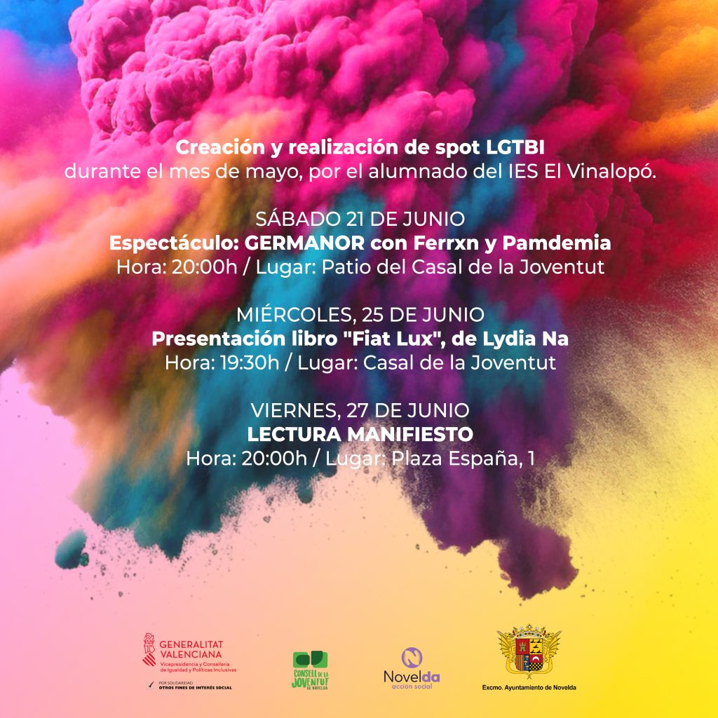 El programa d’activitats va començar el mes de maig passat en l’IES El Vinalopó, on l’alumnat de 1r de Batxillerat d’Arts Escèniques i Musicals ha participat en la creació i realització d’un espot sobre la diversitat LGTBI, i continuarà el dissabte, 21 de juny, a les 19:30h, amb l’espectacle “Germanor” en el Casal de la Joventut i la presentació del llibre de Lydia Na “Fiat Lux” en la vesprada del dimecres, 25 de juny.