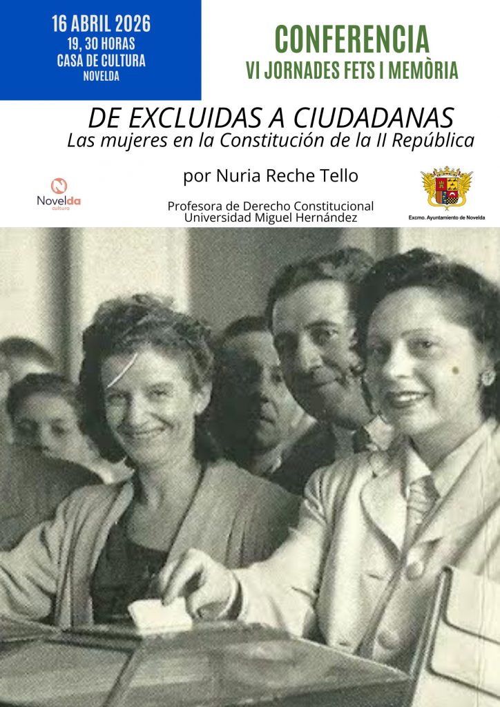 Dos dies després, el dijous 16 d’abril, continuarà la programació amb la conferència “De excloses a ciutadanes. Les dones en la Constitució de la II República”, a càrrec de Nuria Reche Tello, Professora de Dret Constitucional a la Universitat Miguel Hernández. Aquesta activitat, que se celebrarà a les 19:30 hores a la Casa de Cultura, abordarà un moment històric clau en l’evolució dels drets democràtics de les dones a Espanya, des de la conquista del vot femení fins a la ciutadania plena.