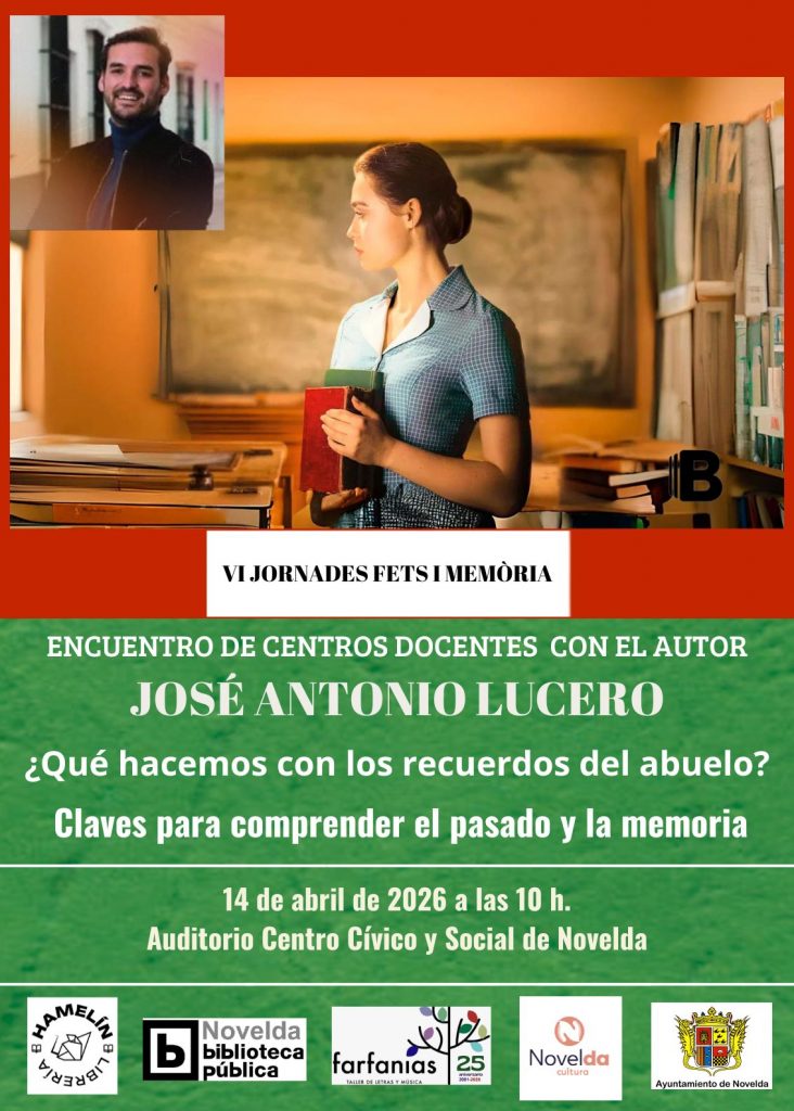 Amb l’objectiu de “aproximar la memòria i la història a tota la ciutadania, i molt especialment als joves”, des de Memòria Democràtica es proposa una programació que comença el dimarts 14 d’abril amb una doble jornada dedicada a la literatura i la memòria educativa, protagonitzada per l’escriptor José Antonio Lucero. Així, a les 10 del matí, a l’Auditori del Centre Cívic i Social, se celebrarà una trobada amb els centres docents dirigida a l’alumnat de 4t d’ESO i 1r de Batxillerat. En aquesta trobada, sota el títol “Què fem amb els records de l’avi?”, es reflexionarà sobre els conceptes de memòria, passat i història centrats en l’experiència personal de l’alumnat, en la memòria dels seus avantpassats i en la visió objectiva del passat recent d’Espanya.