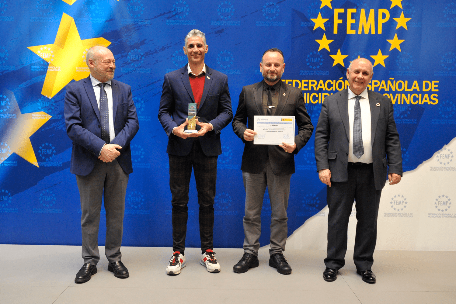 El concejal de Educación, Bartolomé Úbeda, acompañado del oficial de policía local Javier Cuenca, miembro del Gruvime, la unidad de violencia y menores de policía local, y agente tutor especializado en prevención y protección a menores, recogían el pasado viernes en Madrid uno de los premios con los que la FEMP reconoce la labor de los ayuntamientos en la prevención del absentismo escolar, en el caso de Novelda a través del programa “Novelda, ciudad libre de absentismo escolar”, un proyecto que unifica criterios y establece un política de actuación rápida y eficiente para prevenir y sensibilizar sobre el absentismo escolar en todos los centros educativos y entre la comunidad educativa del municipio.