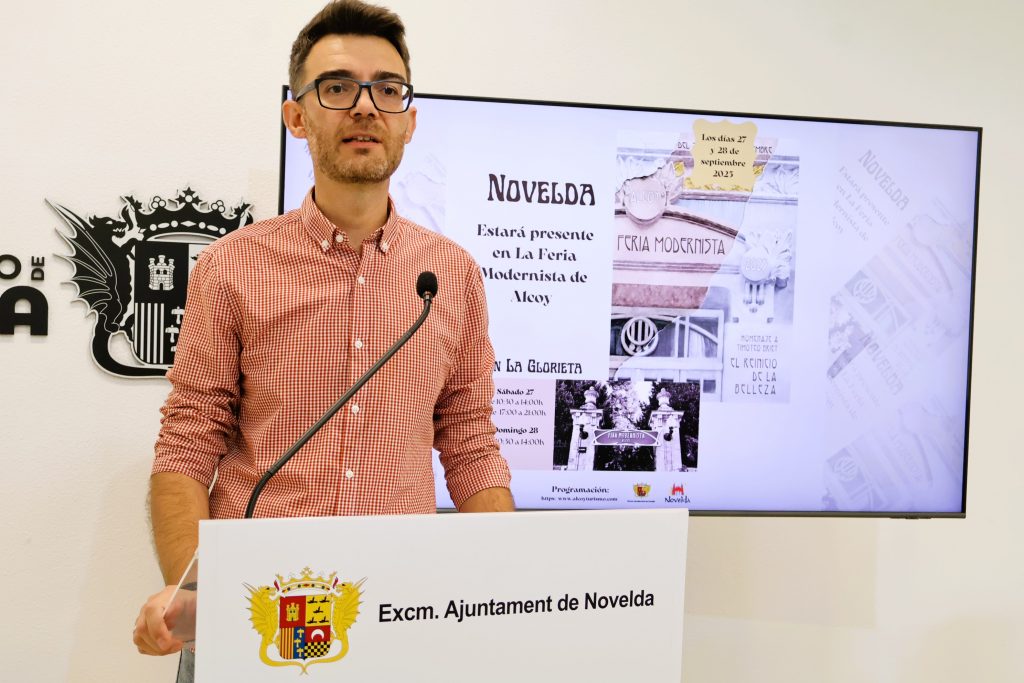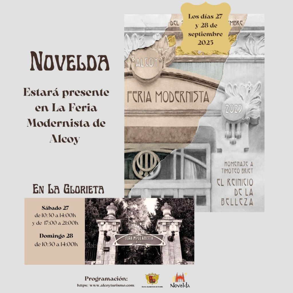 Novelda participarà, un any més, en una nova edició de la Fira Modernista d’Alcoi, que se celebrarà els dies 27 i 28 de setembre. La ciutat comptarà amb una caseta pròpia, situada en la plaça Ramón y Cajal, dins de la Glorieta, on donarà a conéixer la seua riquesa històrica, cultural i patrimonial.