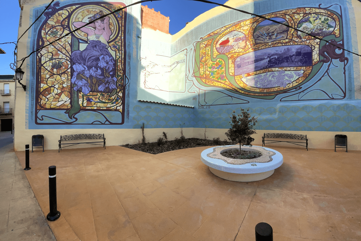 Esta tarde presentado la nueva replaceta del Cantó del Delme, un pequeño rincón de descanso que, decorado con grandes murales de ambientación modernista, forma parte desde hace ya algunos meses del casco antiguo de Novelda.
