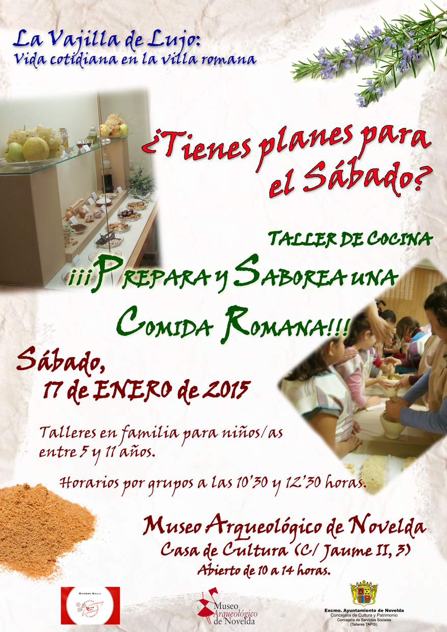 Sábado día 17, a las 10’30 h., y a las 12’30 h., en el Museo Arqueológico (Casa de Cultura). Taller de Cocina: “Prepara y saborea una comida romana”. Taller en familia para niños/as de 5 a 11 años. Organiza: Museo Arqueológico.