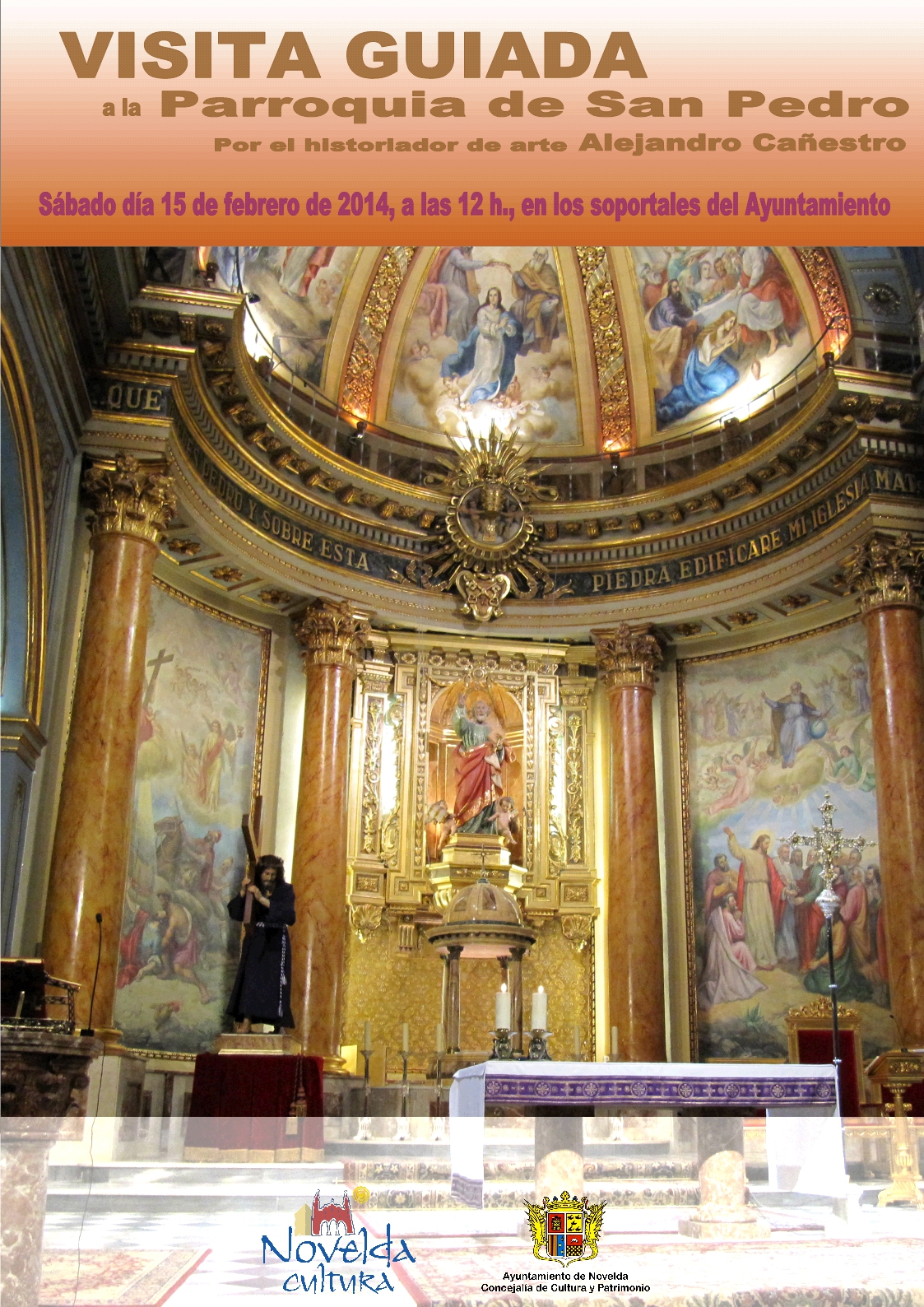 Sábado día 15, a las 12 h., en los soportales del Ayuntamiento punto de encuentro para seguidamente realizar una visita guiada a la Parroquia de San Pedro, por el historiador de arte Alejandro Cañestro.