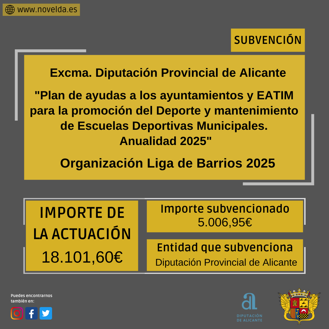 El Ayuntamiento de Novelda ha recibido de la Diputación Provincial de Alicante, en el marco del “Plan de Ayudas a ayuntamientos y EATIM de la provincia para la realización de actividades deportivas y mantenimiento de escuelas deportivas municipales”, una subvención de 5.006,95€ destinada a confinanciar el desarrollo de la Liga de Barrios de Atletismo.