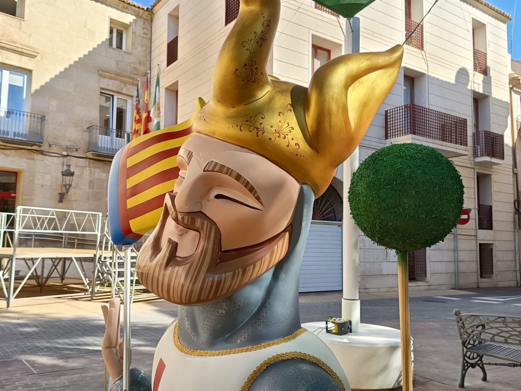 Titulada “Novelda en Festes”, el conjunto escultórico, que arderá en la tarde del día 10 de octubre, está presidida por Jaume I y rinde homenaje a las fiestas de Novelda, incorporando elementos representativos como los correfuegos, los moros y cristianos, las fiestas de barrios o la feria modernista.