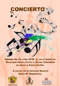 width=Sábado día 15, a las 19’30  h., en el Auditorio Municipal Centro Cívico y Social. Concierto en honor a Santa Cecilia, a cargo de la Sociedad Musical Santa Mª Magdalena.