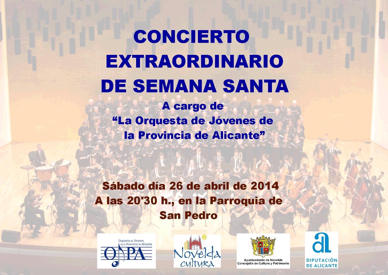 Sábado día 26, a las 20’30 h. en la Parroquia de San Pedro. Concierto extraordinario de Semana Santa por la “Orquesta de Jóvenes de la Provincia de Alicante”. Soprano: Pepa García Maciá y María Maciá. Director: Francisco Mestre.