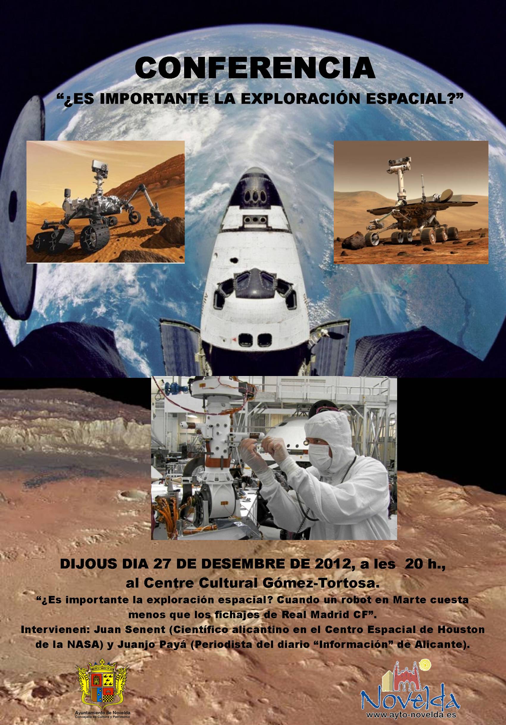 Jueves día27, a las 20 h., en el Centro Cultural Gómez-Tortosa. Conferencia “¿Es importante la exploración espacial? Cuando un robot en Marte cuesta menos que los fichajes de Real Madrid CF”. Intervienen: Juan Senent (Científico alicantino en el Centro Espacial de Houston de la NASA Y Juanjo Payá (Periodista del diario “Información de Alicante).