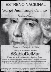 La obra, titulada precisamente “Jorge Juan, sabio del mar” es original del grupo de teatro Carasses y se estrena el próximo sábado, día 27, en el parque Viriato de Novelda ya que “hemos querido que la primera representación se haga en la ciudad natal de Jorge Juan antes de que empiece a rodar por el resto del país”.