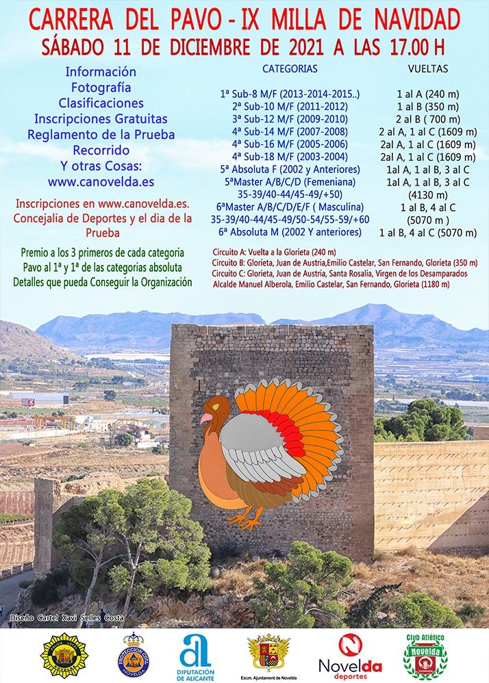 El próximo sábado, 11 de diciembre, la Glorieta acogerá, desde las 17:00h, una nueva edición de la tradicional Carrera del Pavo-IX Milla de Navidad, una prueba organizada conjuntamente por la concejalía de Deportes y el Club Atlético Novelda-Carmencita, con la colaboración de la Diputación de Alicante.