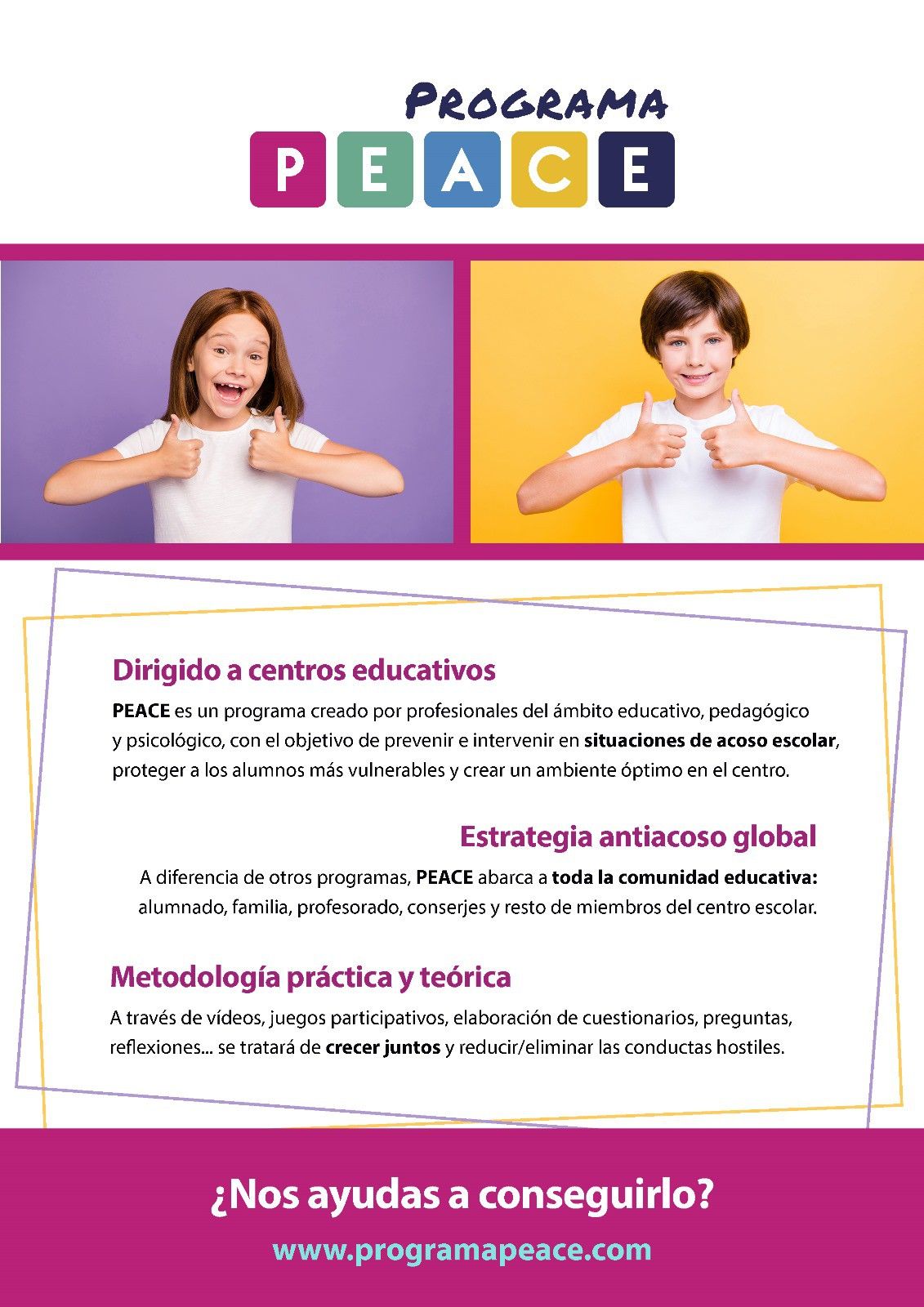 La concejalía de Educación oferta a los centros escolares el programa PEACE (Programa Escolar Antiacoso para Centros Educativos), una iniciativa creada por profesionales del ámbito educativo para prevenir e intervenir en situaciones de acoso escolar.
