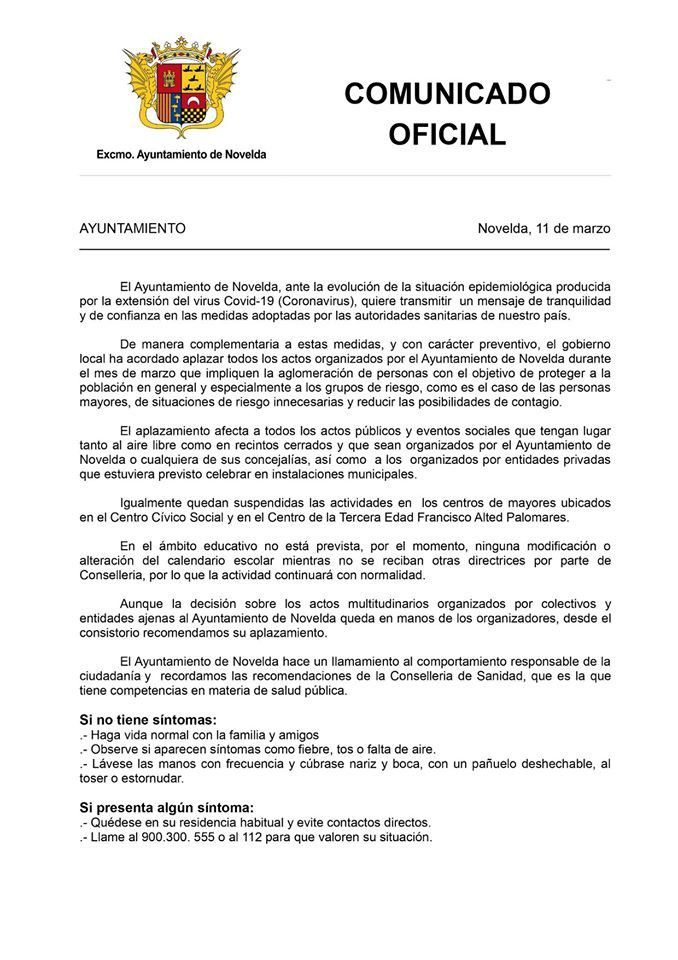Tras la decisión del gobierno municipal, adoptada en la tarde de ayer, de aplazar todas las actividades organizadas por el Ayuntamiento de Novelda o que, propuestas por entidades privadas, estuviera previsto celebrar en instalaciones municipales durante el mes de marzo, Fran Martínez ha querido lanzar un mensaje de tranquilidad y hace un llamamiento a la responsabilidad social.