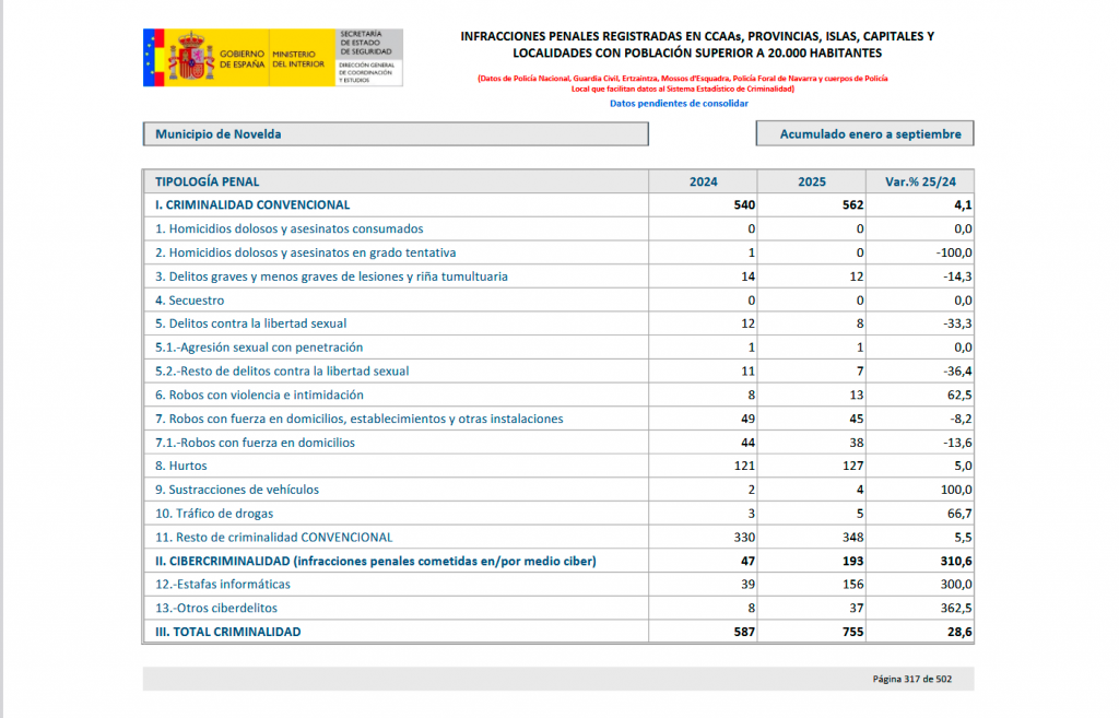 En este mismo periodo la criminalidad convencional ha experimentado un ligero aumento del 4,1%, con un incremento de 540 delitos en 2024 a 562 delitos entre enero y septiembre de 2025. “Si atendemos únicamente a los delitos convencionales, Novelda se sitúa por debajo de la media de las ciudades de su mismo rango de población”, ha subrayado el Intendente.