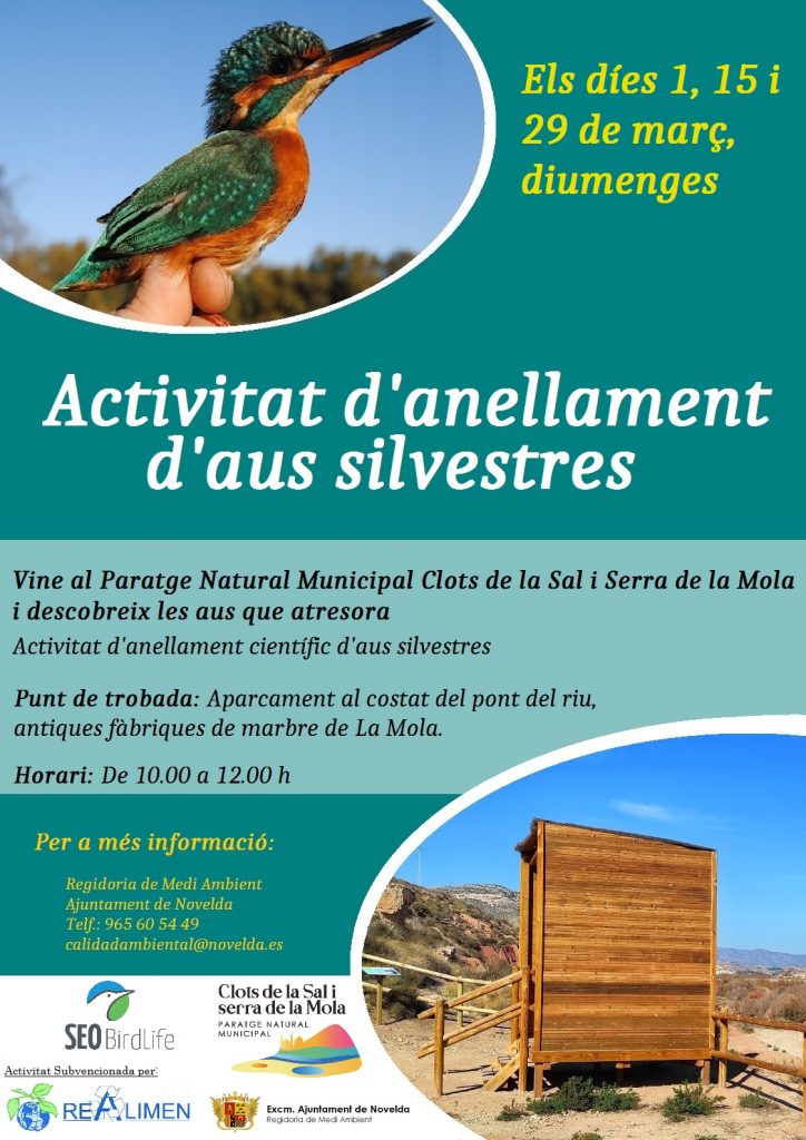 La concejalía de Medio Ambiente organiza una nueva jornada de anillamiento científico de aves en el Paratge Natural Municipal Clots de la Sal i Serra de la Mola. Una actividad gratuita y abierta a la ciudadanía que te permitirá conocer de cerca cómo trabajan los especialistas en el seguimiento de aves migratorias que atraviesan nuestro entorno natural. Domingos: 1, 15 y 29 de marzo. Horario: de 10:00 a 12:00 h. Punto de encuentro: Aparcamiento junto al puente del río, en las antiguas fábricas de mármol de La Mola La iniciativa se desarrolla junto a un anillador experto dentro del programa PASEM de SEO/BirdLife y permite estudiar especies como el mosquitero común o las currucas, contribuyendo a la conservación de nuestra biodiversidad. Desde el punto de encuentro se accederá caminando hasta el observatorio de aves del río Vinalopó, donde se realizará la actividad. ¡Una oportunidad única para aprender, disfrutar de la naturaleza y conocer el importante trabajo científico que se realiza en nuestro paraje!