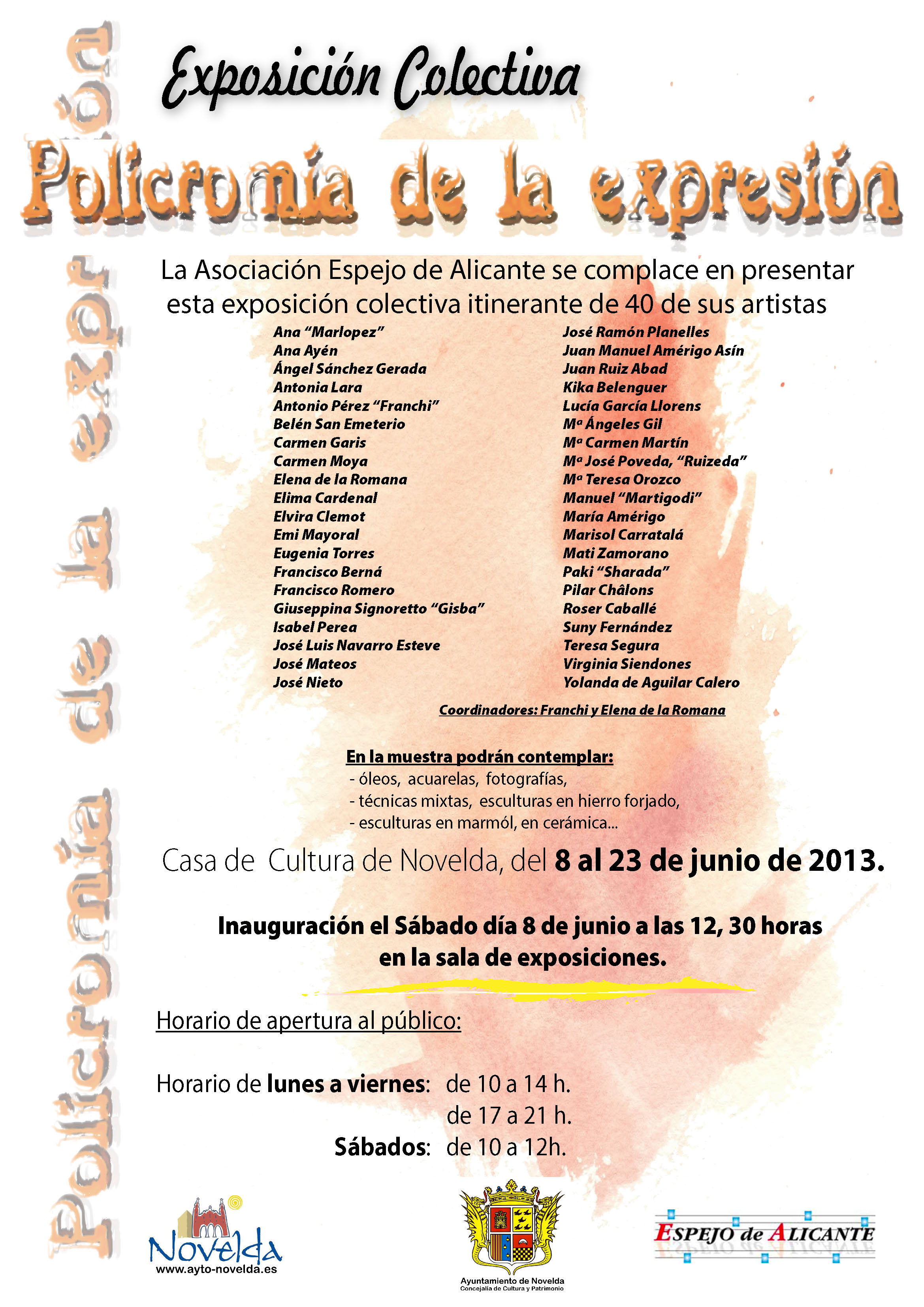 Del 8 al 23, en la Casa de Cultura. Exposición colectiva de arte (pintura, escultura y cerámica) “Policromía de la expresión”. Organizada por la Asociación Espejo de Alicante.