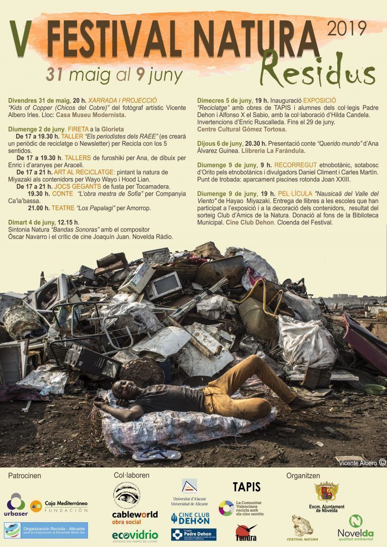 Los Residuos son el eje alrededor del cual se ha organizado un variado programa de actividades que se extenderán hasta el 9 de junio y que, tal como señaló Rosana Arango, miembro de la Asociación Festival Natura, “pretenden transmitir una conciencia medioambiental con actuaciones de carácter lúdico, cultural y educativo” y que comienza hoy viernes, día 31, a las ocho de la tarde en la Casa-Museo Modernista con una charla y la presentación del proyecto audiovisual titulado “Kids of Copper” (Chicos del Cobre) del fotógrafo noveldense Vicente Albero Irles.