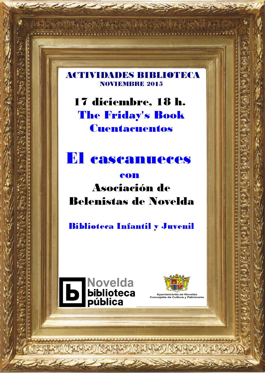 Jueves día 17, a las 18’00 h., en la Biblioteca Infantil y Juvenil. Friday’s Book. Cuentos de Navidad «El Cascanueces» a cargo de la Asociación de Belenistas de Novelda. Organiza: Biblioteca Municipal.