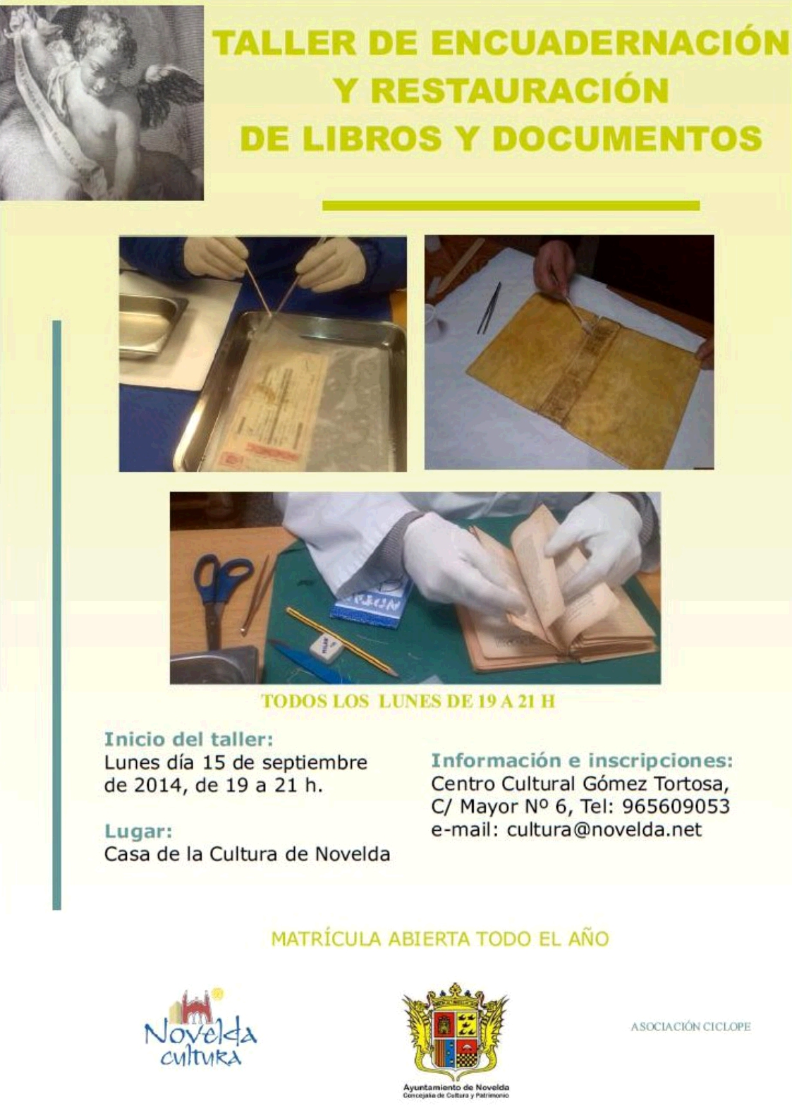 15-09-2014 CARTEL TELLER ENCUADERNACIONLunes  día 15 de septiembre, a las 19 h., en la Casa de Cultura. Inicio del taller de encuadernación y restauración de libros y documentos.