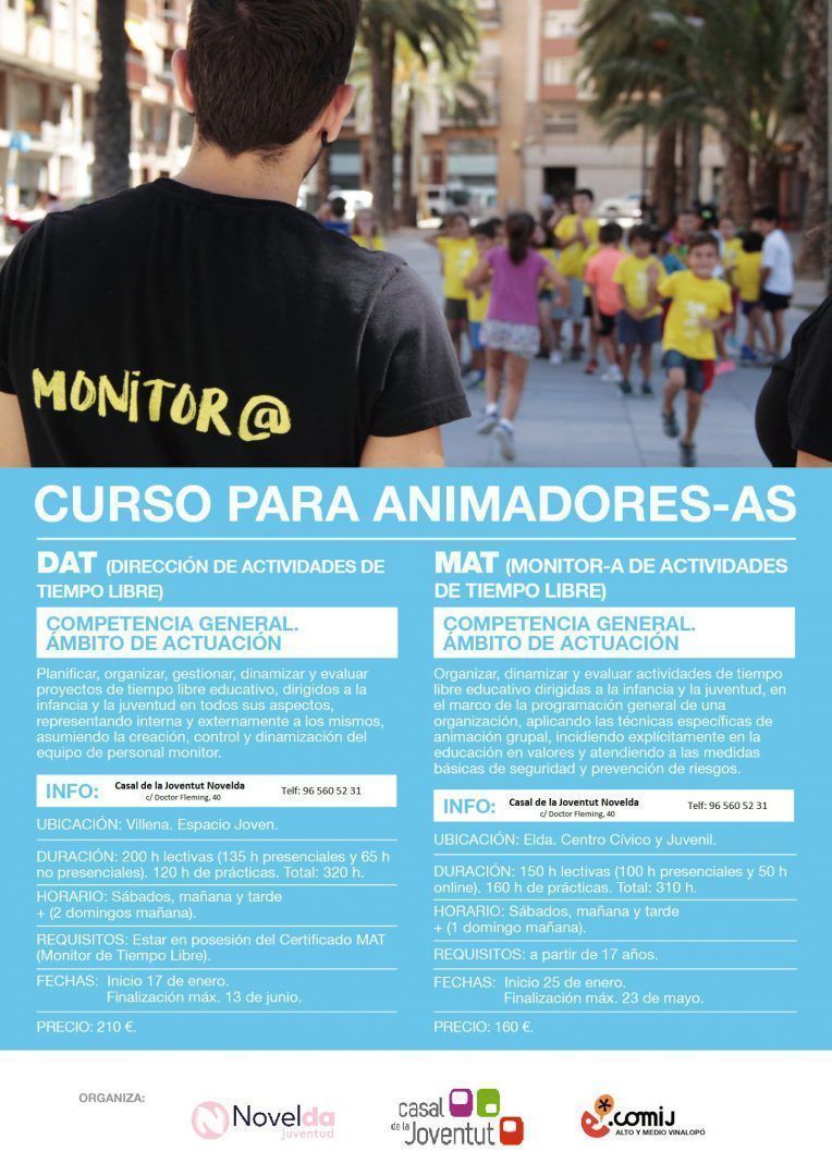 El curso de Monitor de Actividades de Tiempo Libre Educativo Juvenil e Infantil, que se desarrollará del 25 de enero al 23 del mayo, se realizará en el Centro Cívico y Juvenil de Elda con una duración de 310 horas lectivas y un precio de 160 euros. Por su parte el Espacio Joven de Villena acogerá el curso de Dirección de Actividades de Tiempo Libre Educativo Juvenil e Infantil, del 17 de enero al 13 de junio, con una duración de 320 horas lectivas y un precio de 210 euros. Las inscripciones se podrán realizar en el Casal de la Juventud, del 2 de diciembre al 10 de enero, y ambos cursos tendrán una parte práctica que se podrá realizar en el Casal.